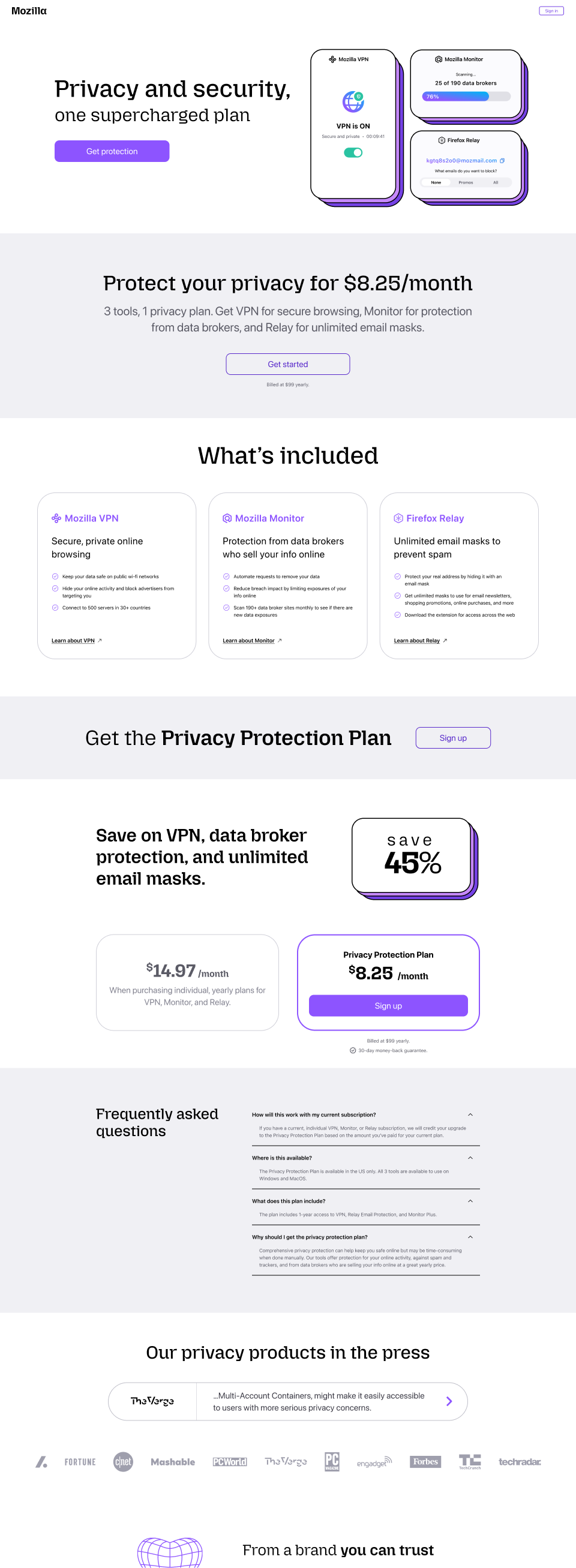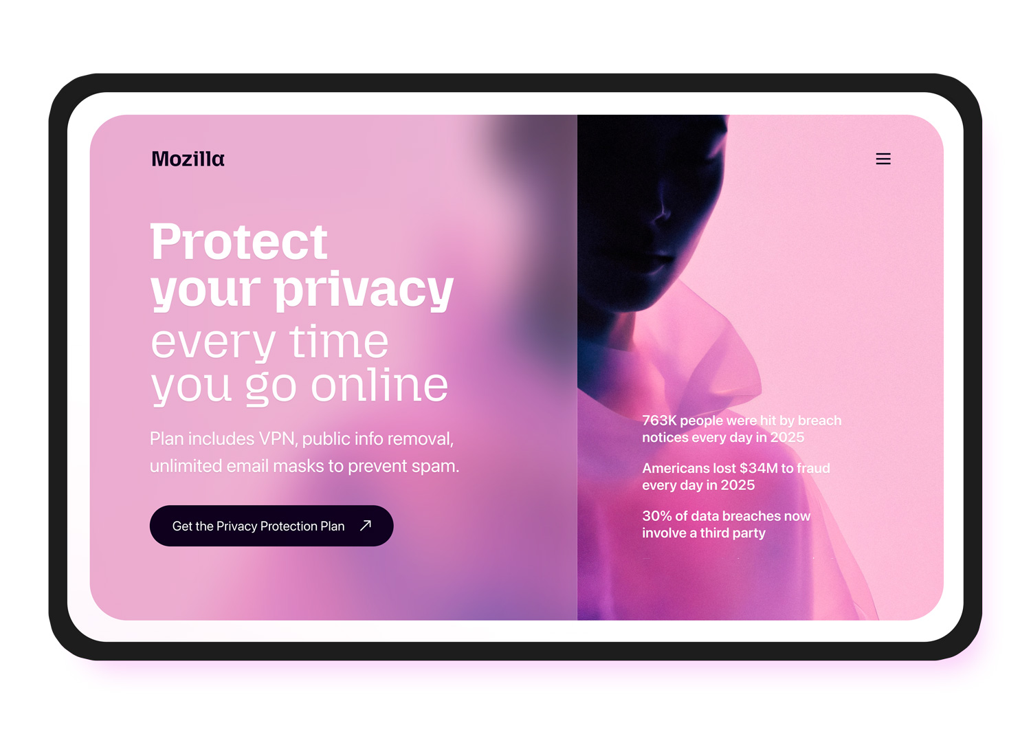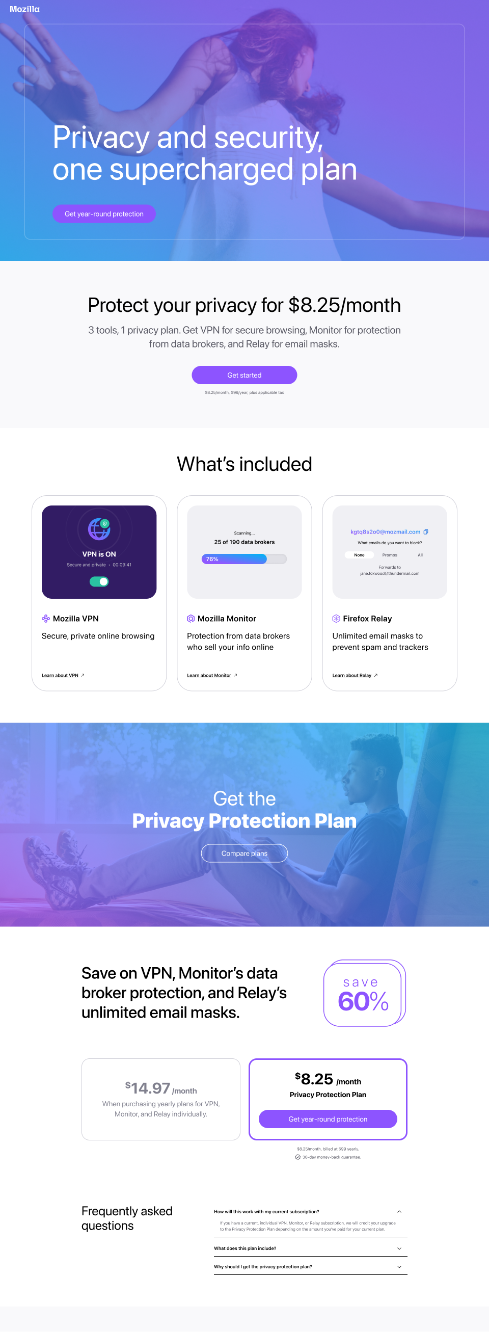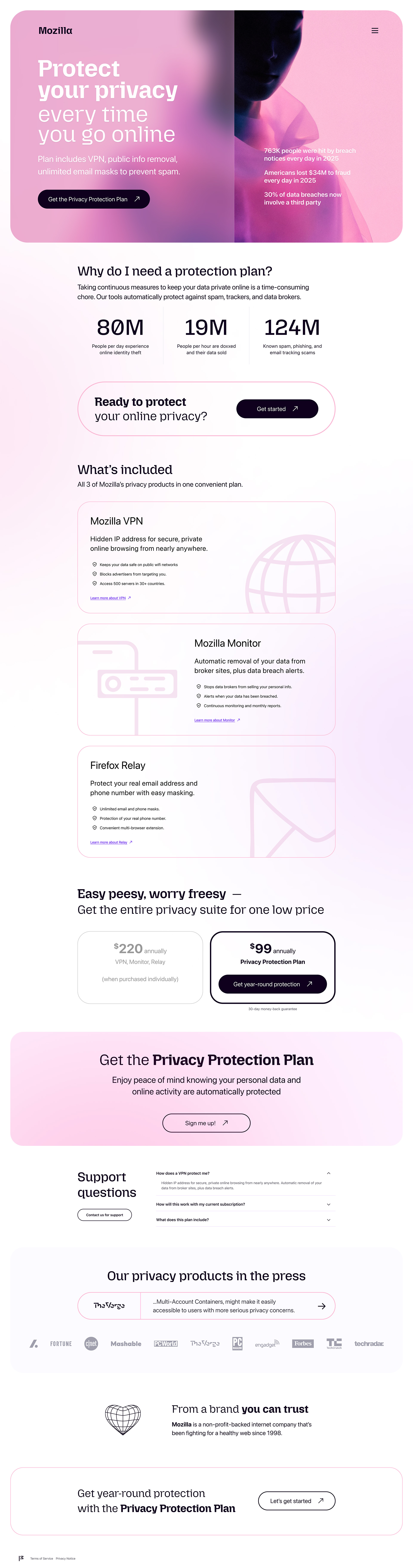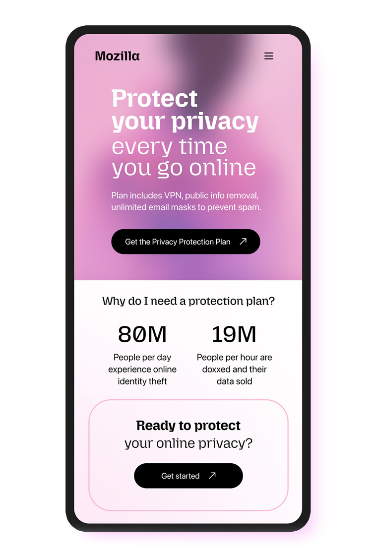 Mozilla Privacy Protection Plan: designing a bold landing page for Mozilla’s new bundled privacy subscription, combining Firefox Monitor Plus, Firefox Relay, and Mozilla VPN into a single offer.
