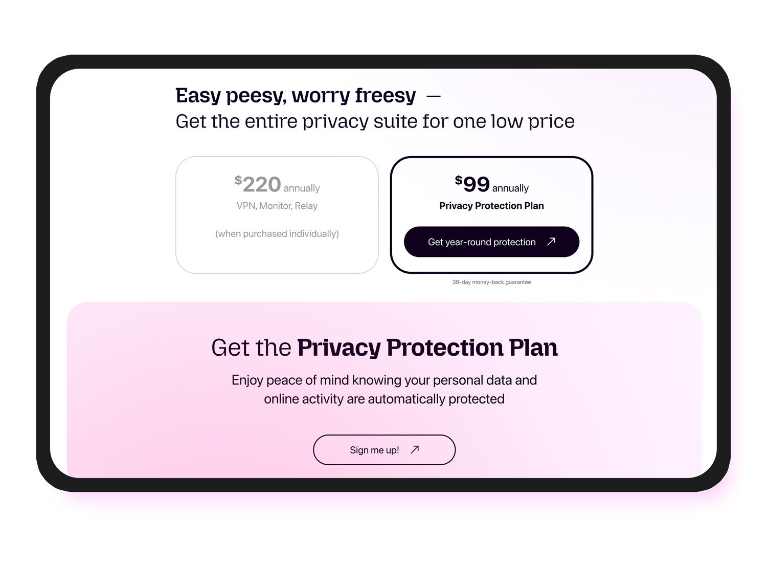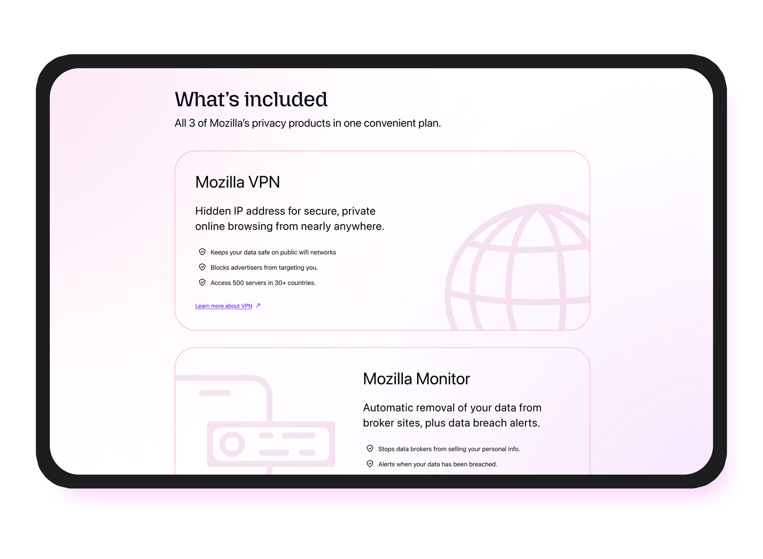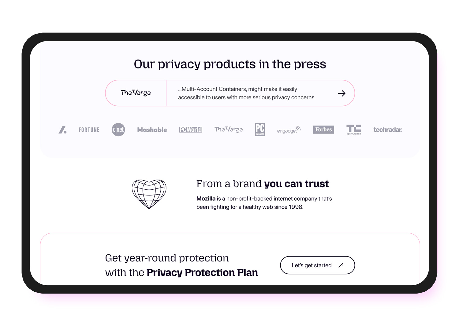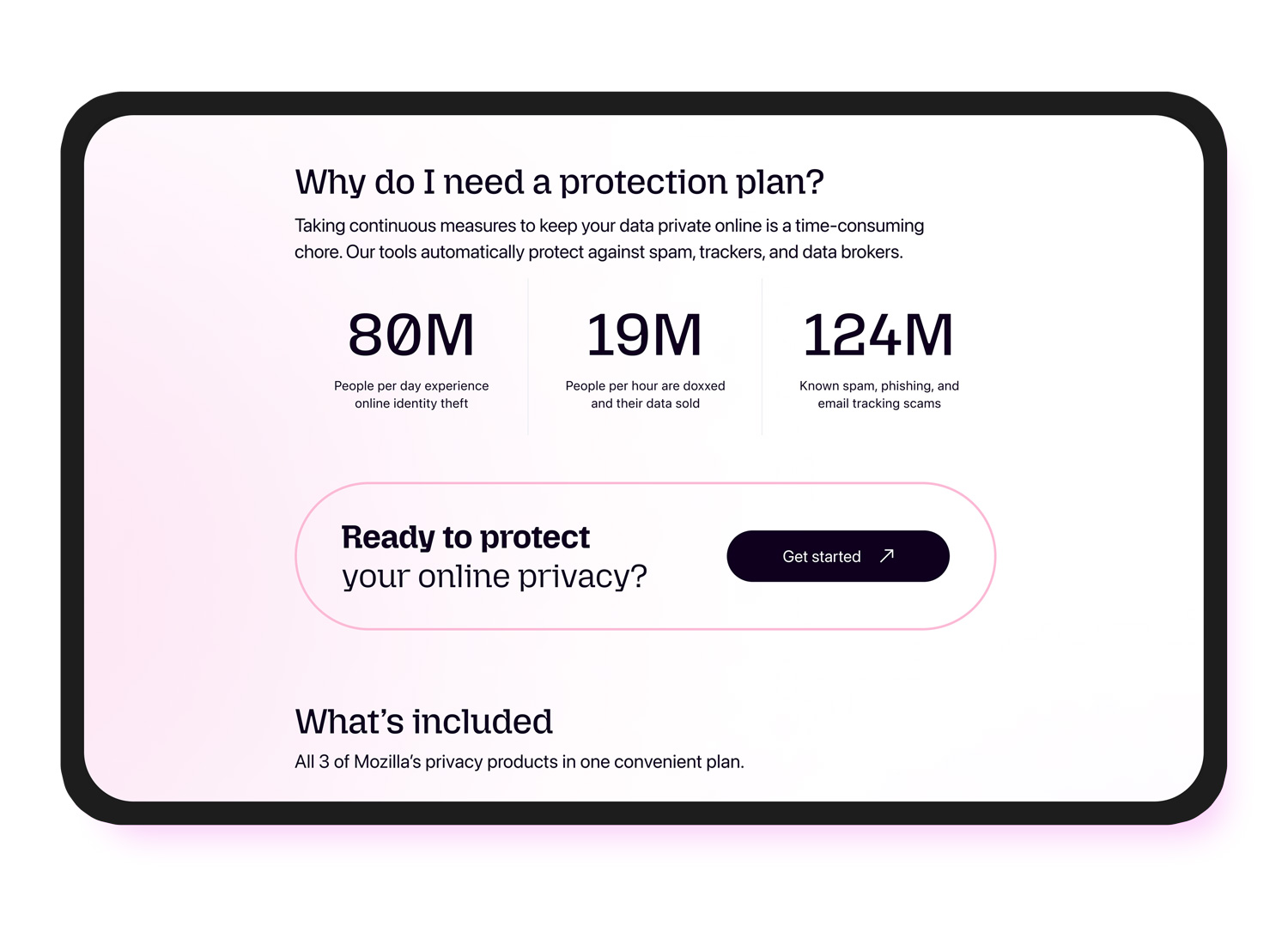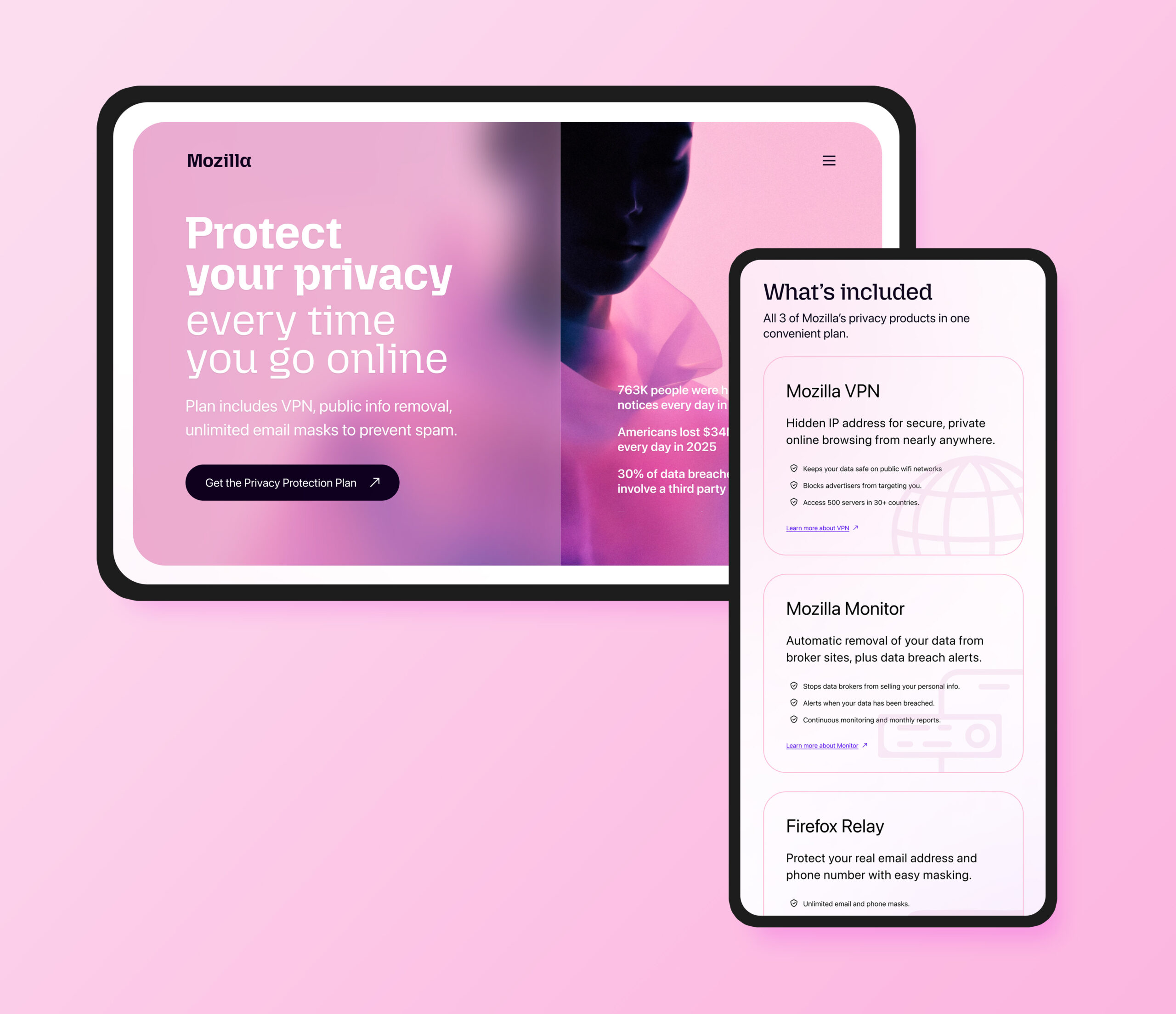 Mozilla Privacy Protection Plan: designing a bold landing page for Mozilla’s new bundled privacy subscription, combining Firefox Monitor Plus, Firefox Relay, and Mozilla VPN into a single offer.