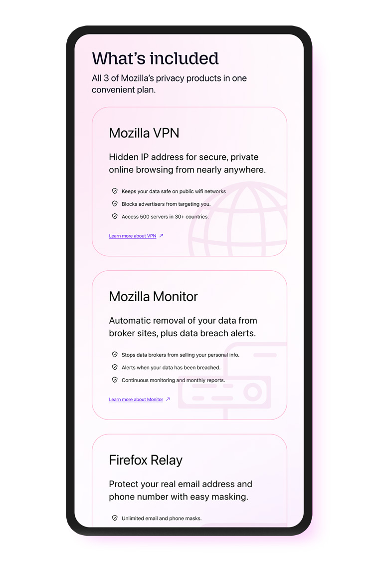 When Mozilla bundled Firefox Monitor Plus, Firefox Relay, and Mozilla VPN into one discounted subscription, I designed the landing page used to launch and explain the offer as a single privacy solution. The page was intentionally aimed at a younger audience, so the visual direction pushed beyond Mozilla’s typical product marketing while still needing to feel credible, accessible, and aligned with the broader Firefox and Mozilla ecosystem. The final design uses a bold pink and purple palette, high-contrast typography, and a clear conversion path to balance visual energy with clarity and trust.