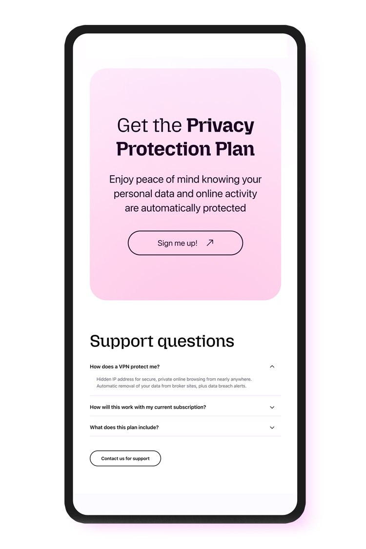 A central part of the hero was a scrolling, terminal-like text block featuring real stats about online privacy, email spam, doxxing, and digital safety. It was designed to create urgency without feeling alarmist, helping frame the problem space in a way that felt dynamic, credible, and clear. We chose this approach instead of screenshots or in-app imagery because showing all three products individually made the offer feel fragmented. The animation created a more unified metaphor for risk and protection, reinforcing that the bundle was meant to work as a connected privacy solution rather than a set of separate tools.