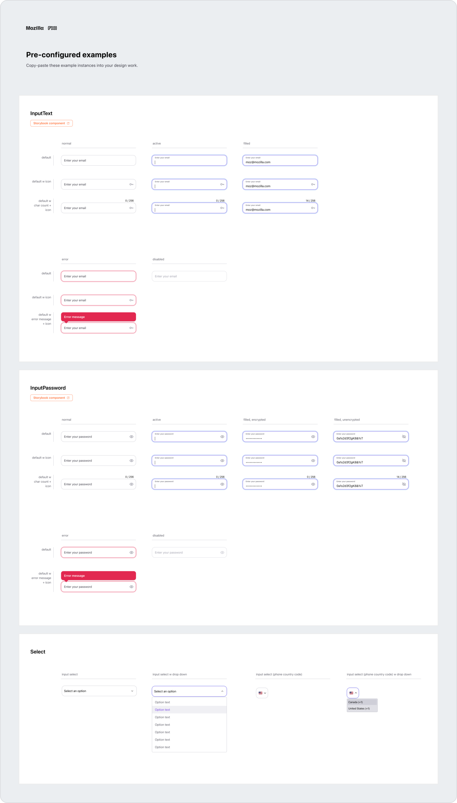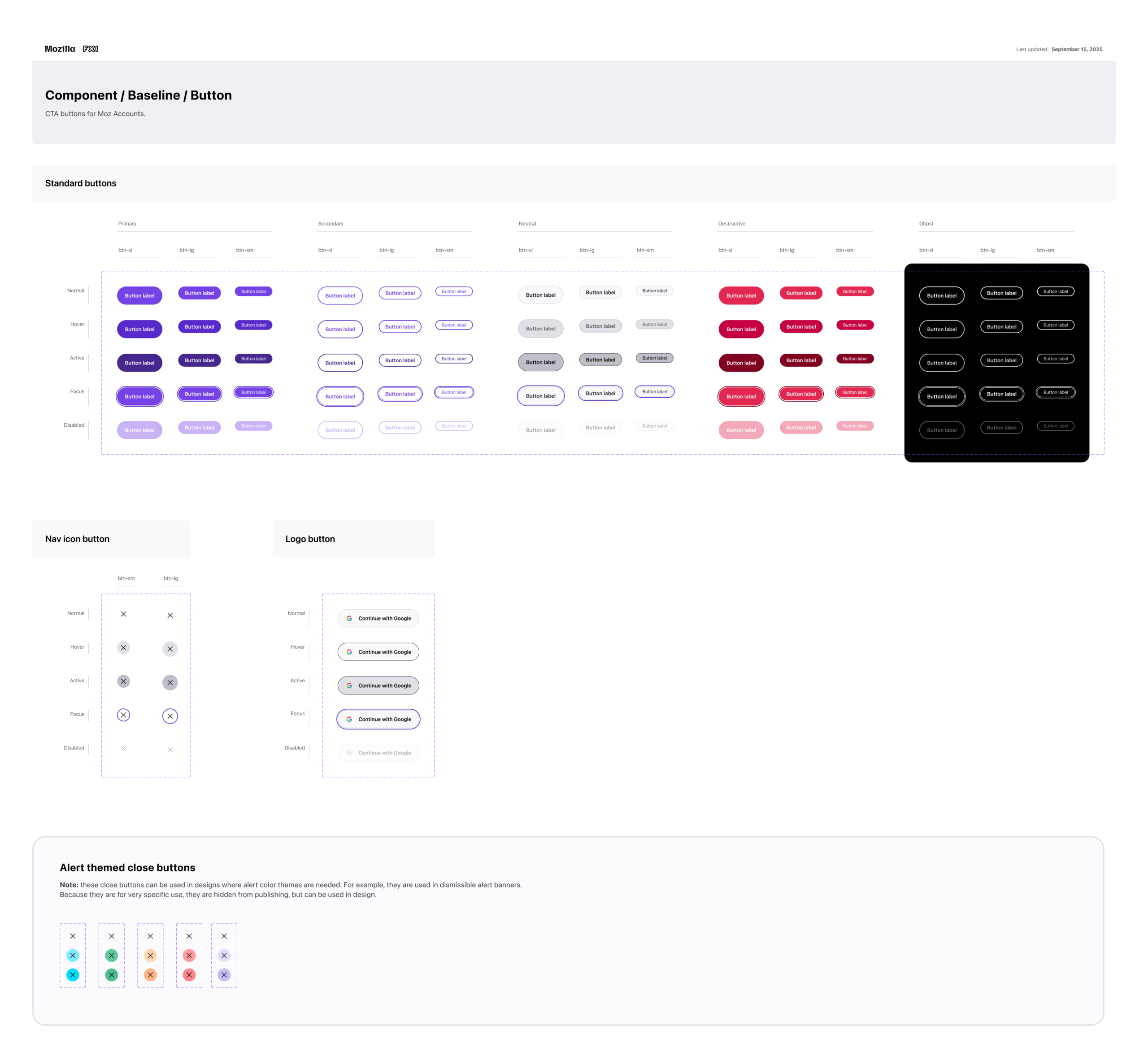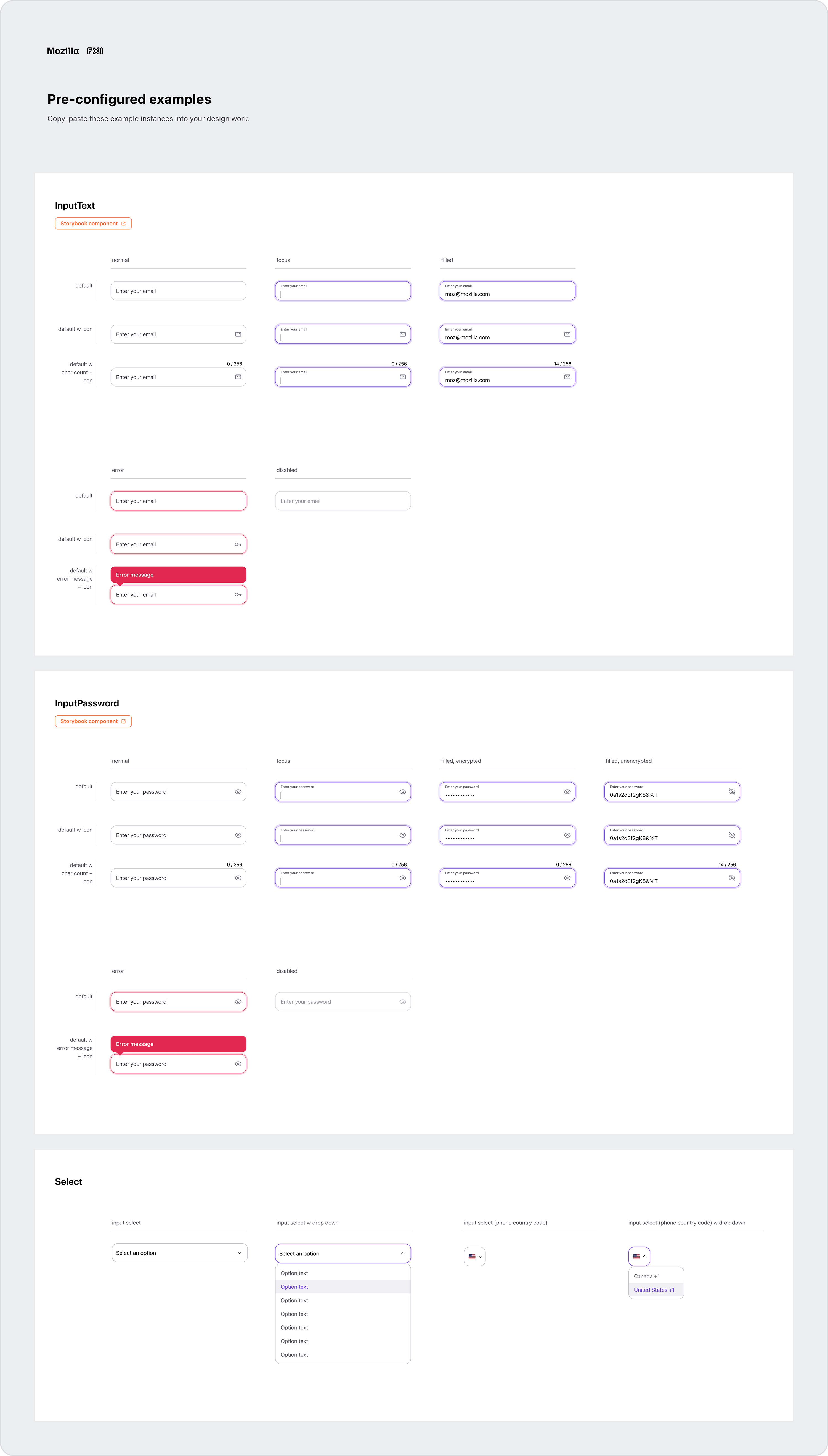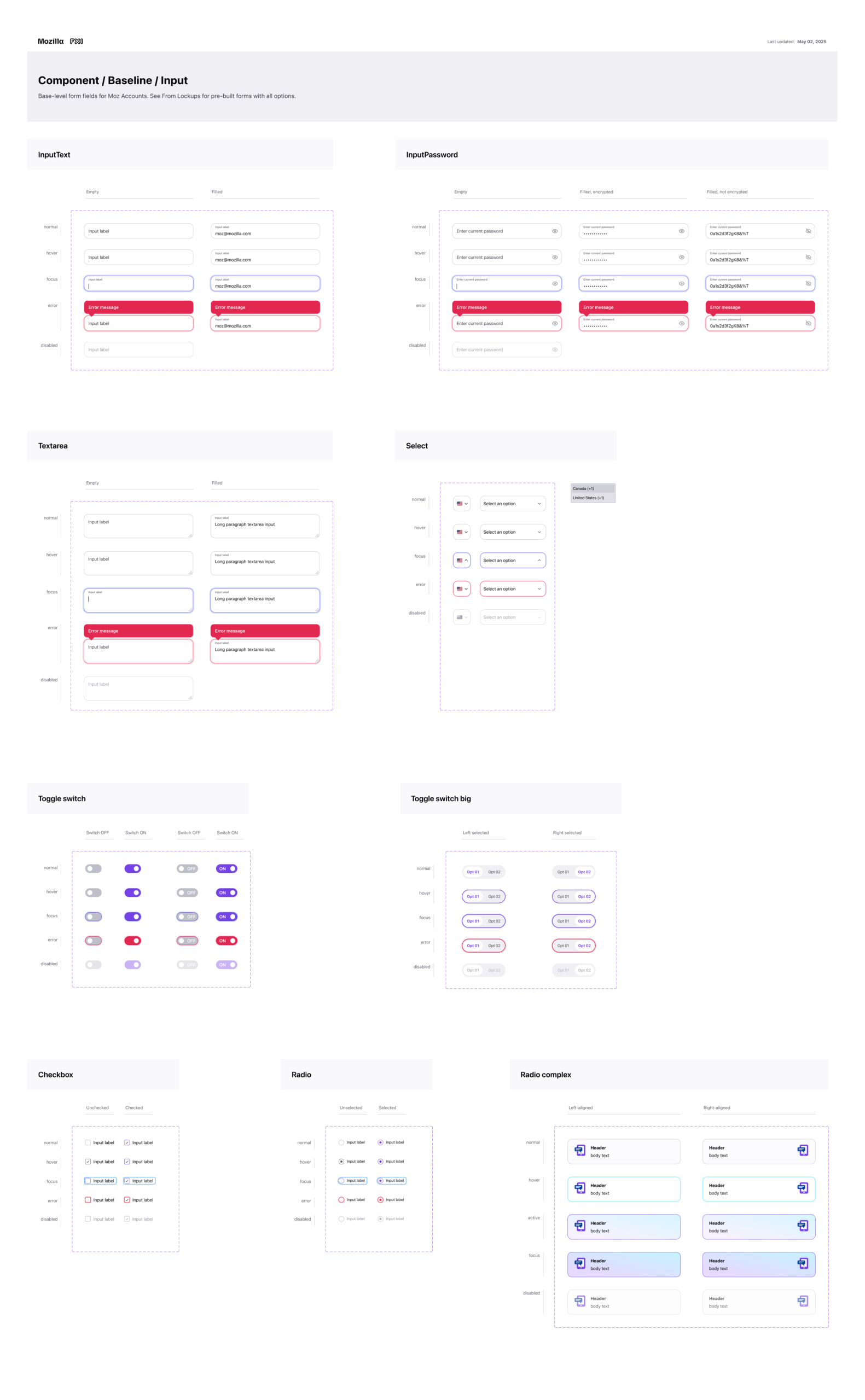 My responsibilities included translating existing Storybook codebases into Figma, auditing coded components for UX and UI issues, identifying accessibility and parity gaps, directing updates, and partnering with engineering to implement. I also defined where Firefox styles should be inherited, where custom patterns were needed, and how the system should scale across multiple brands and products.