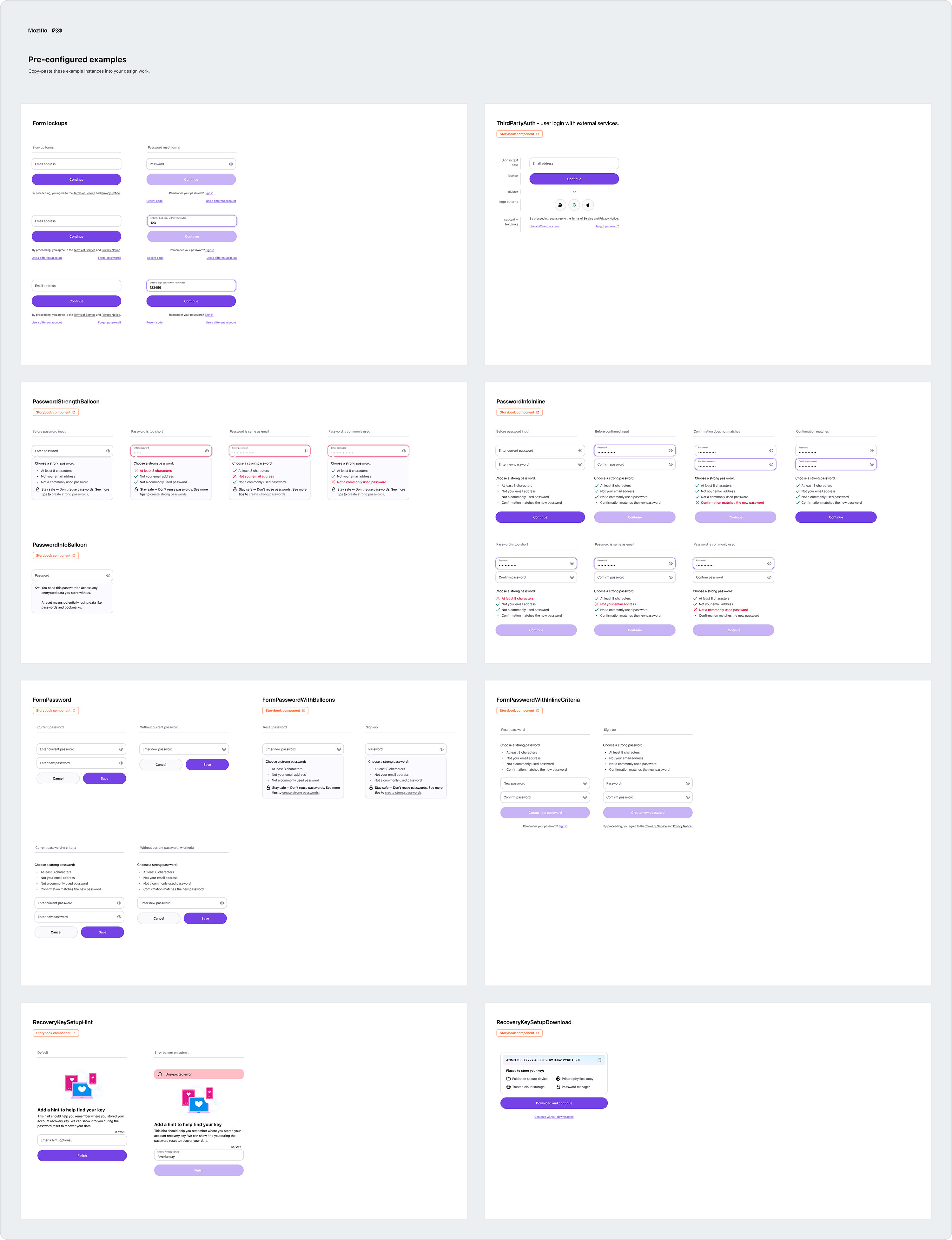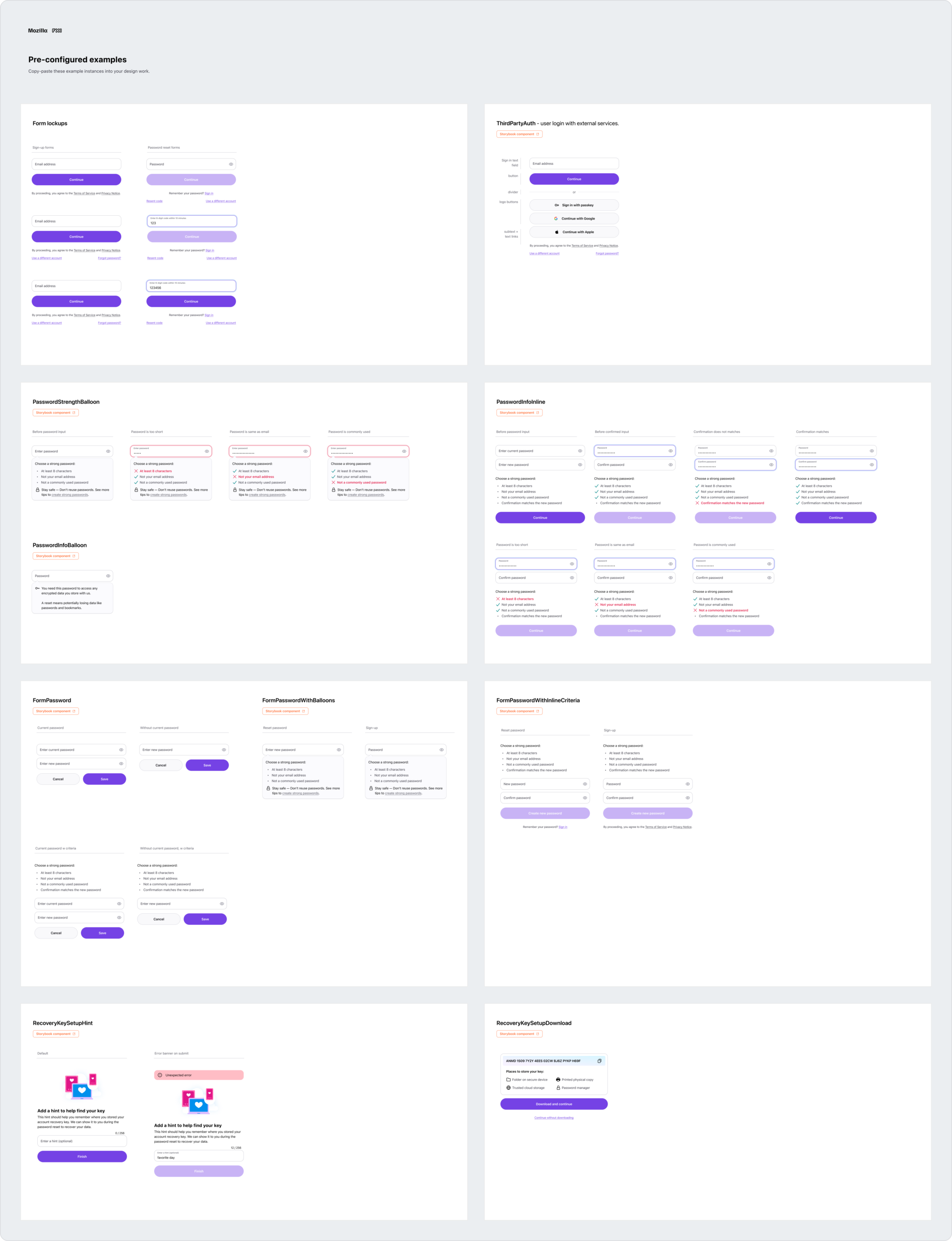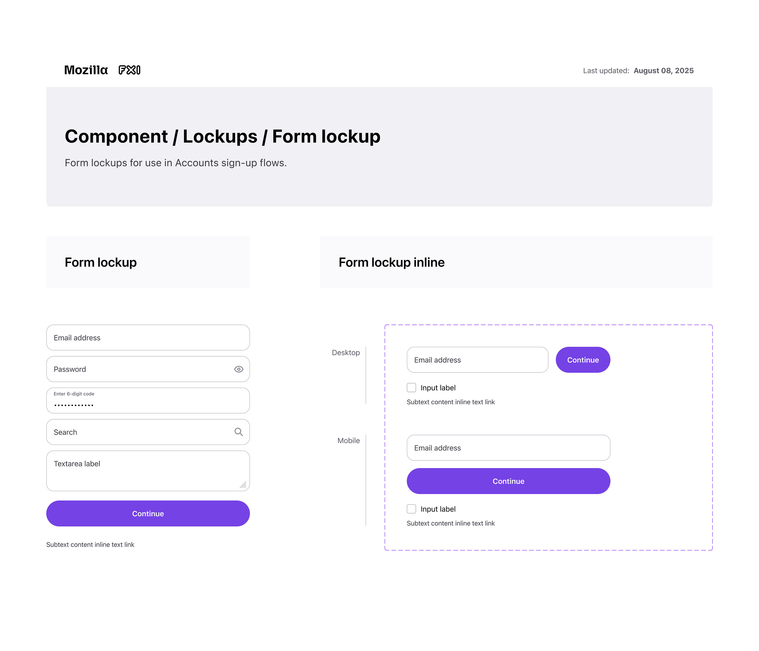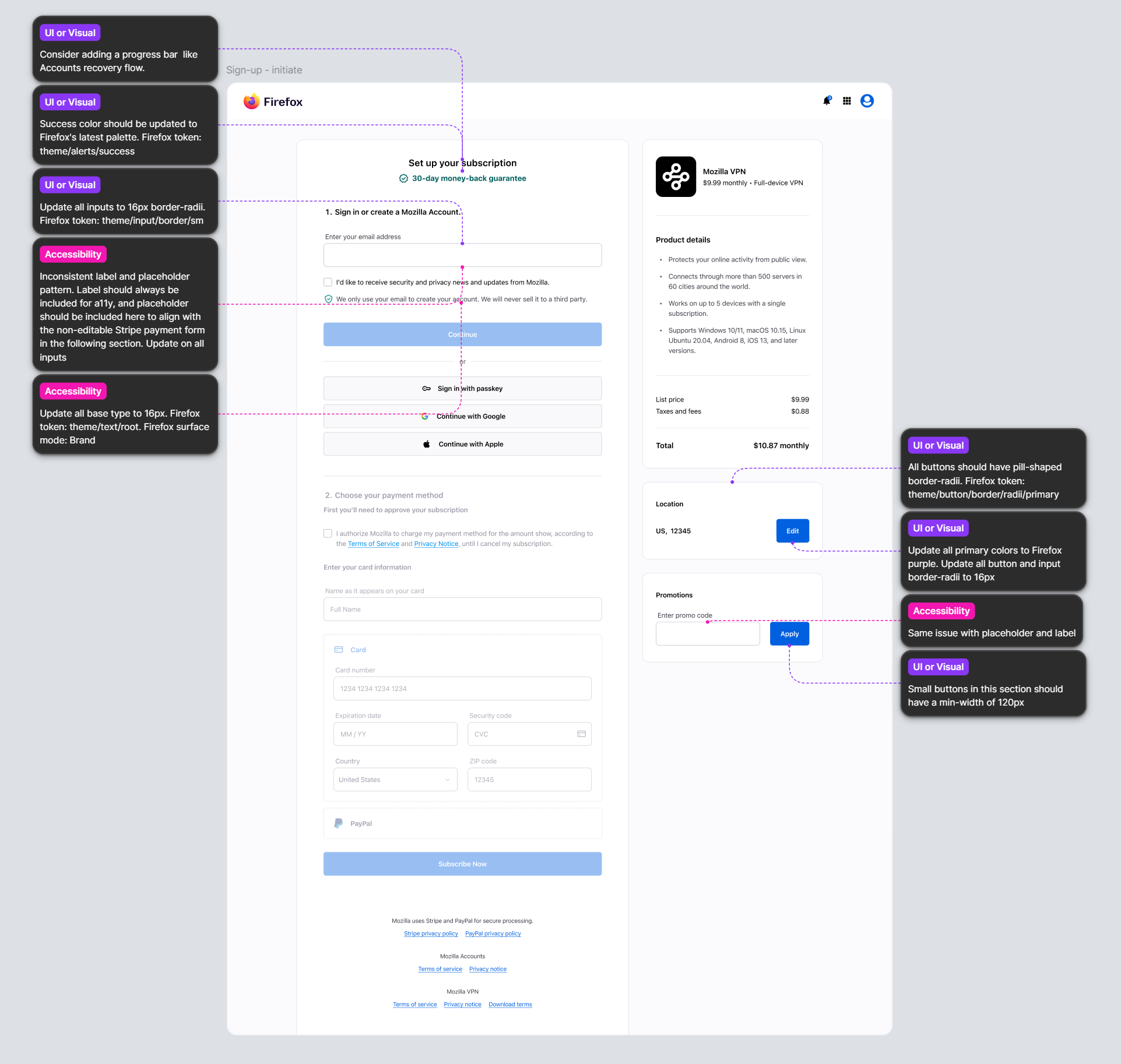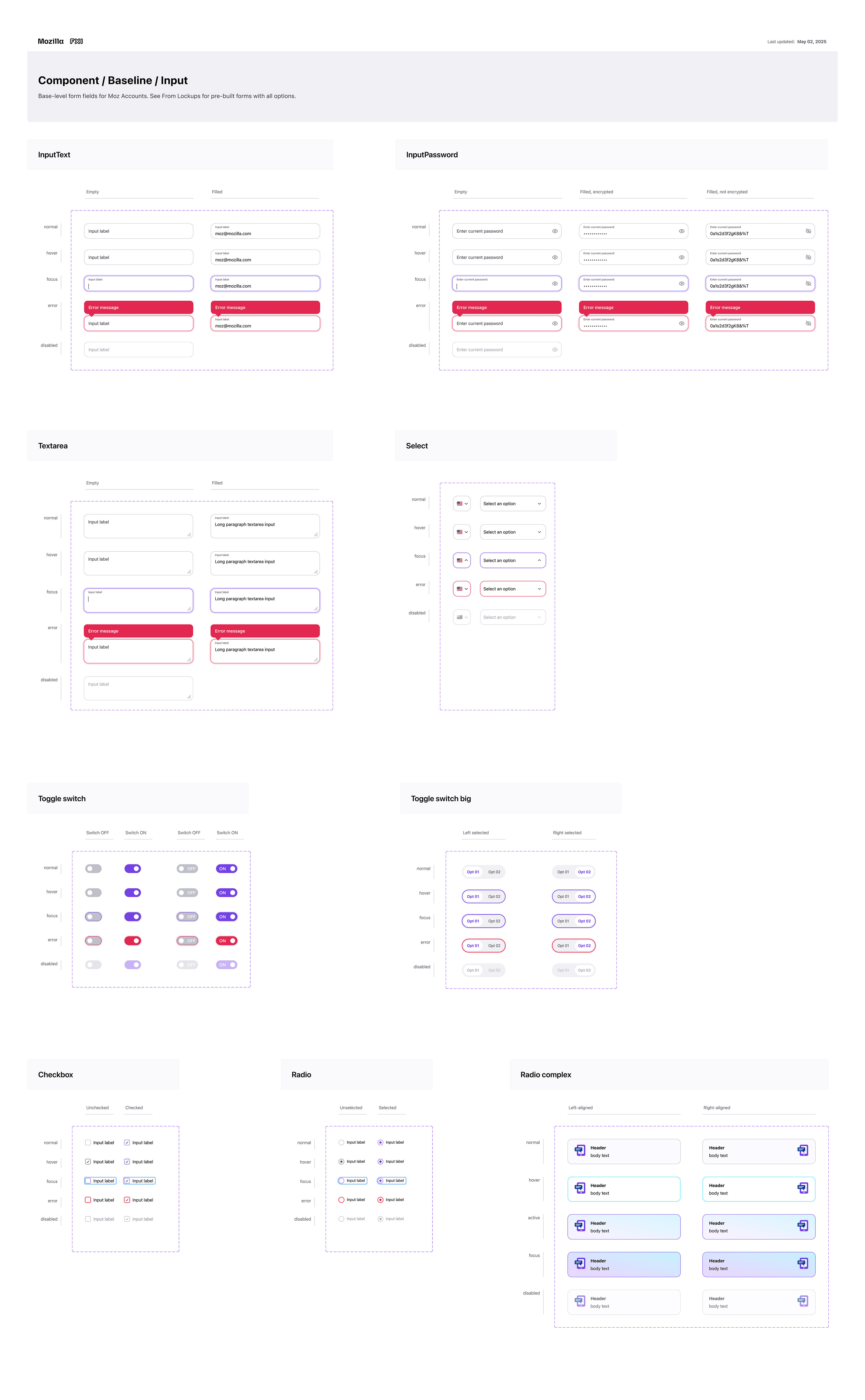 A key strategic part of the work was determining where the system and design flows should inherit directly from Firefox design language, and where product-specific patterns still needed to exist. I worked through areas that overlapped with Firefox styles, replacing custom or inconsistent treatments with Firefox-aligned patterns where it reduced divergence, while preserving enough flexibility for account and subscription experiences to function within their own product needs. This helped correct the earlier disconnect between the products’ UX and Firefox design language, while maintaining a practical system for the product teams.