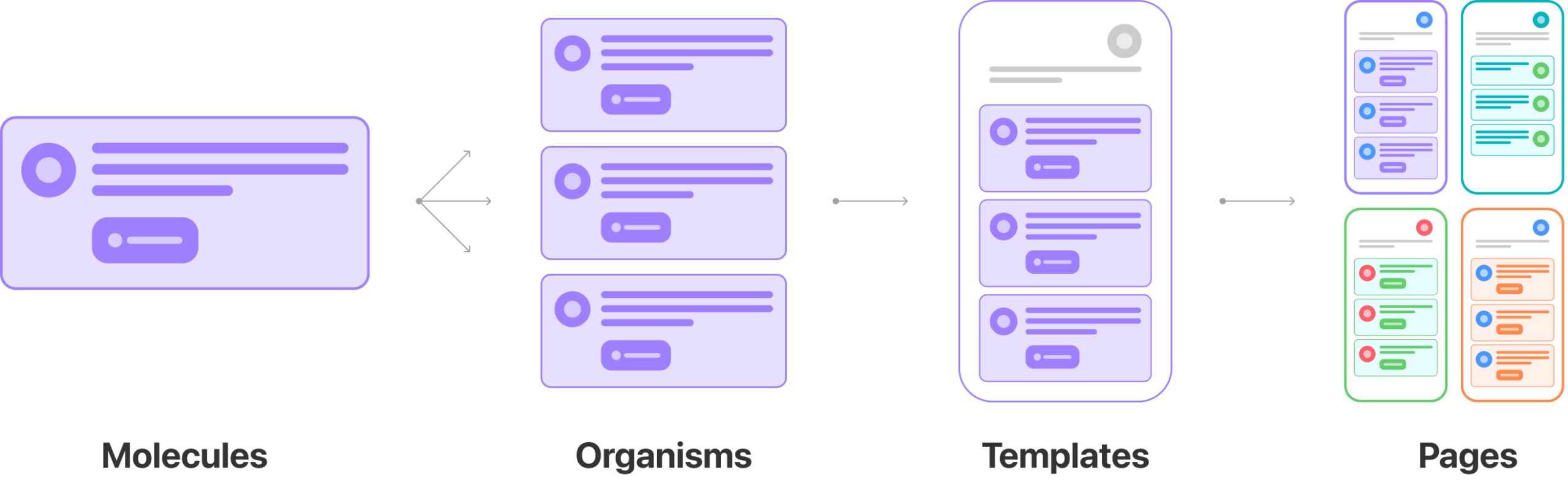 Components start at the “molecule” level, eliminating tedious atom-level components altogether, and sharing assets and resources where applicable. This goes a long way in preventing design entropy and runaway complexity.