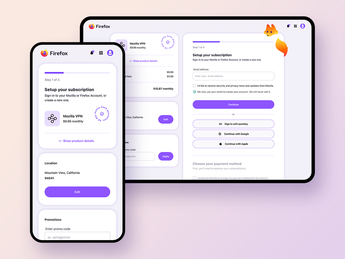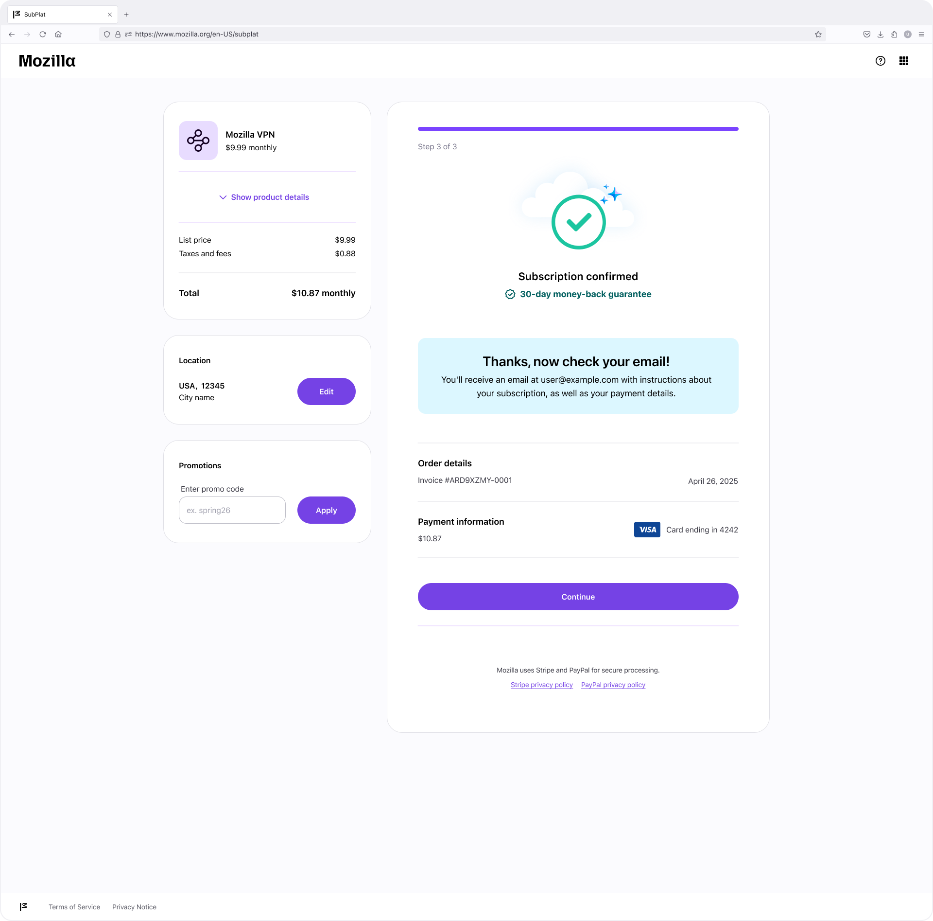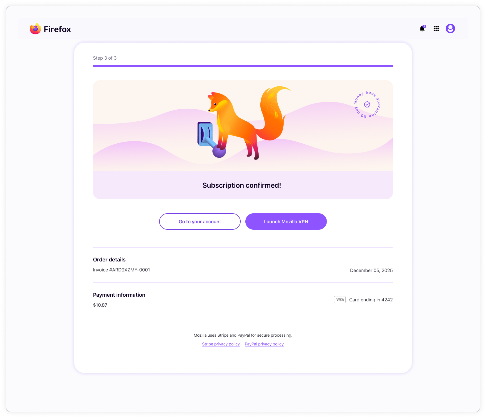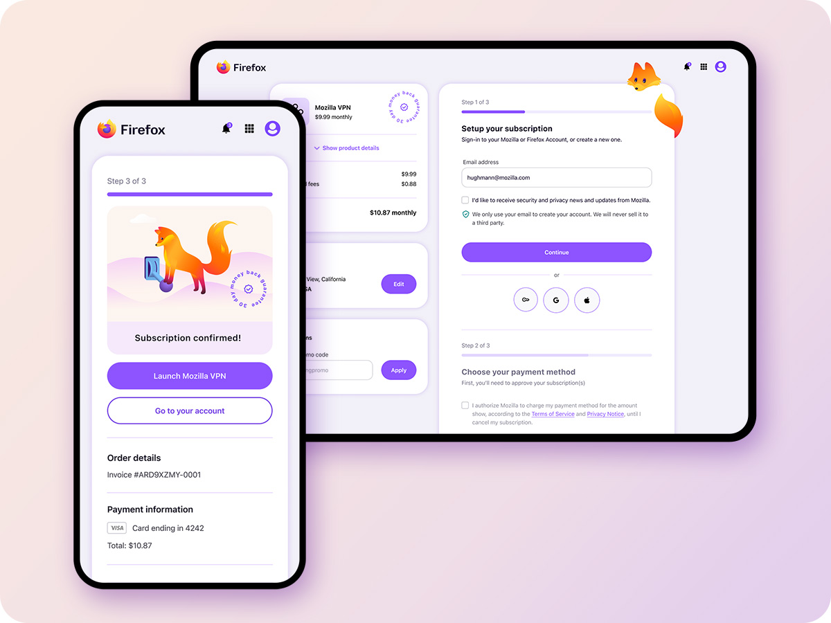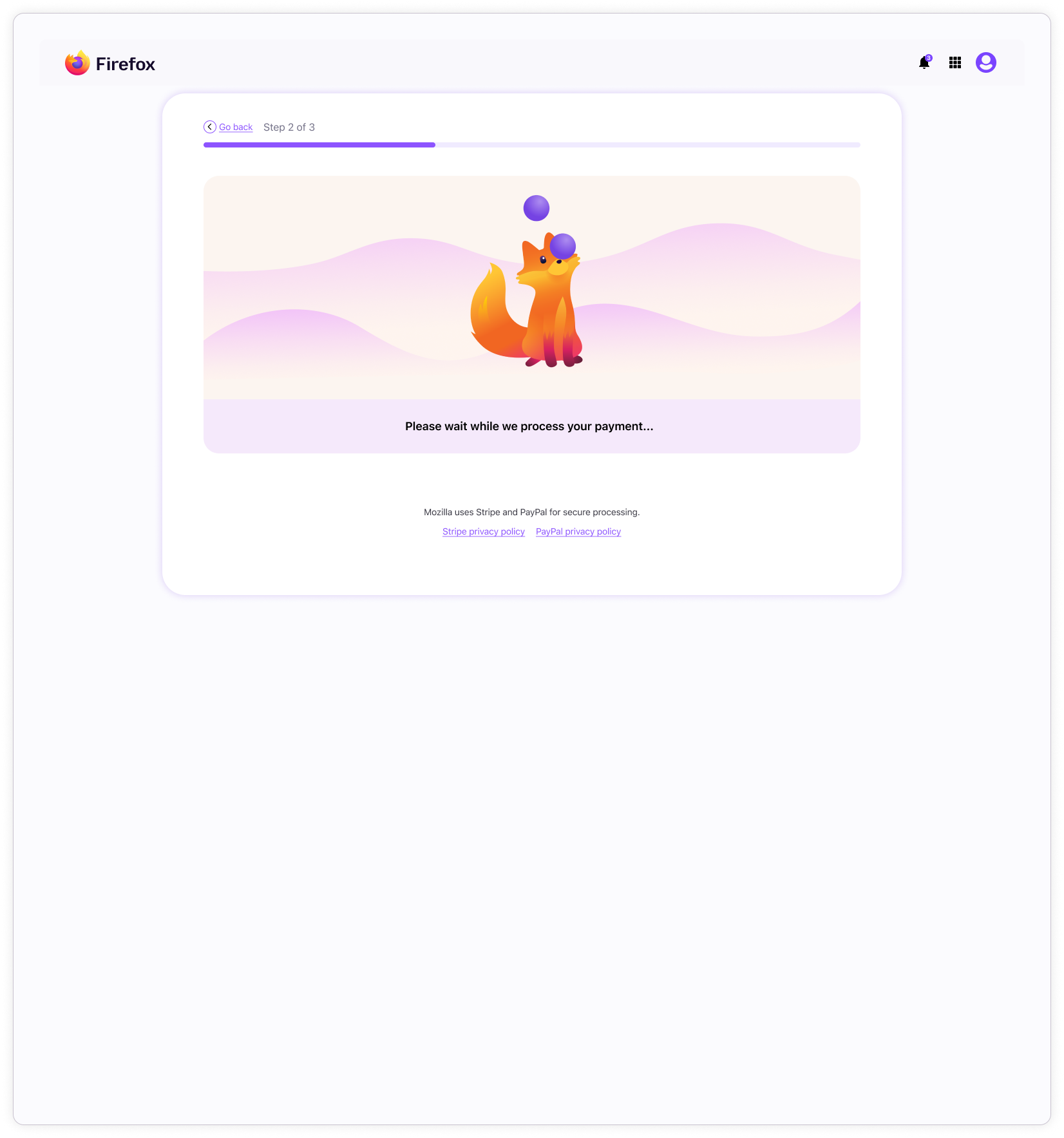 New visual concepts were crafted in collaboration with Accounts’ UX manager and Subplat’s product manager. We were all keen on adding delightful elements, such as instances of Firefox’s new mascot (aka Kit), confetti, animated transitions, and motion graphics. Applied thoughtfully, this level of care for the user creates warmth, and a stronger sense of responsiveness, helping sign-up and subscription flows feel more engaging.