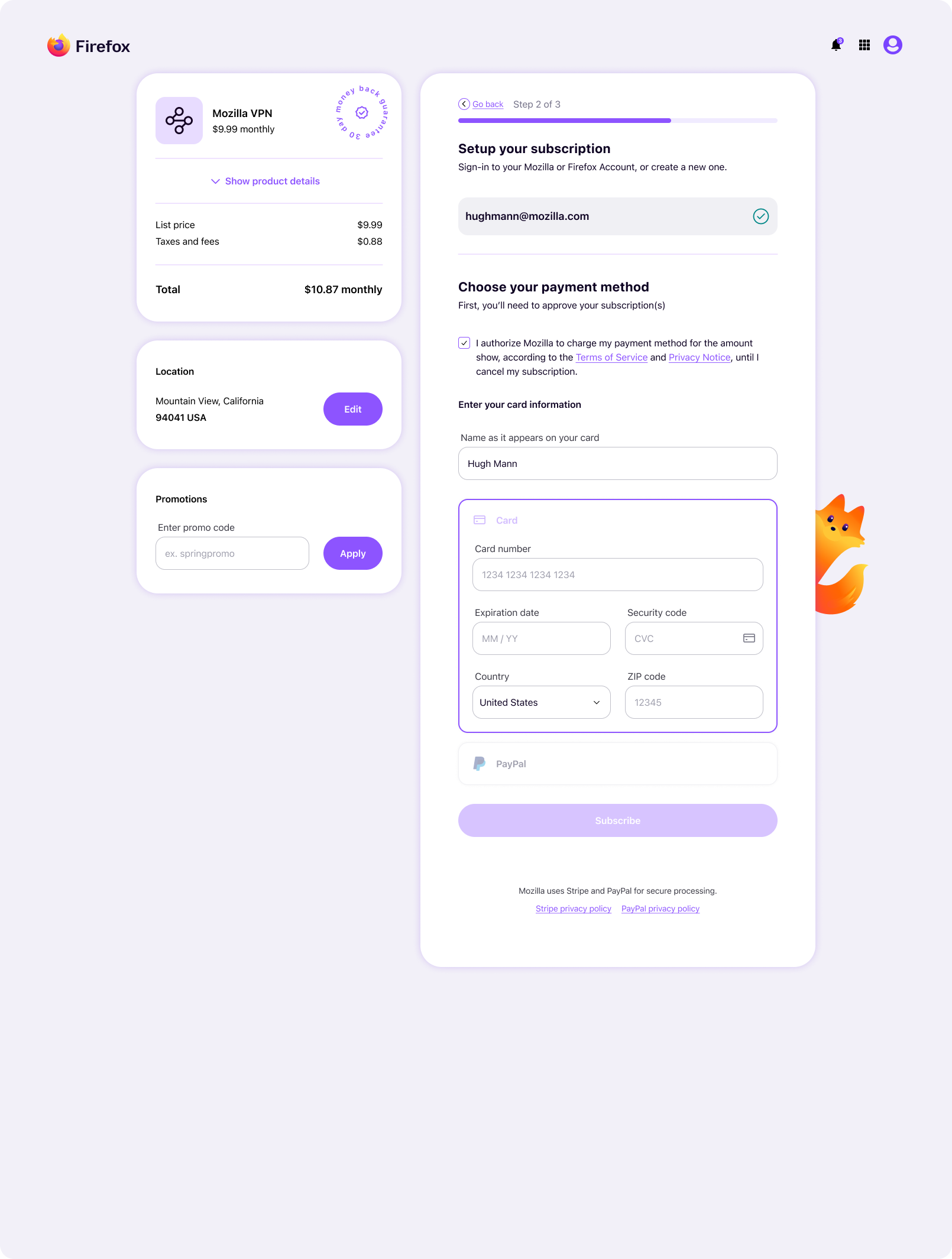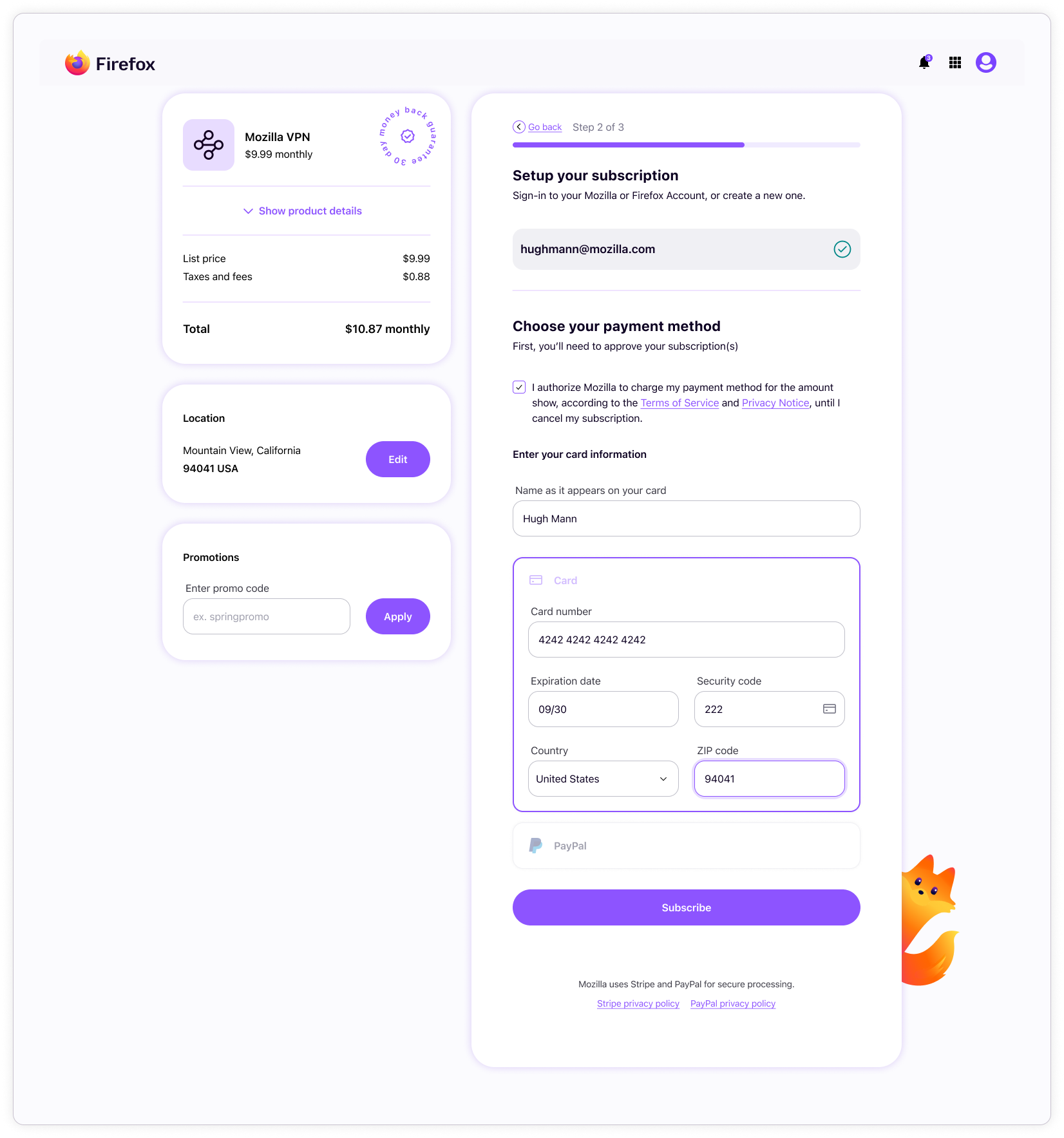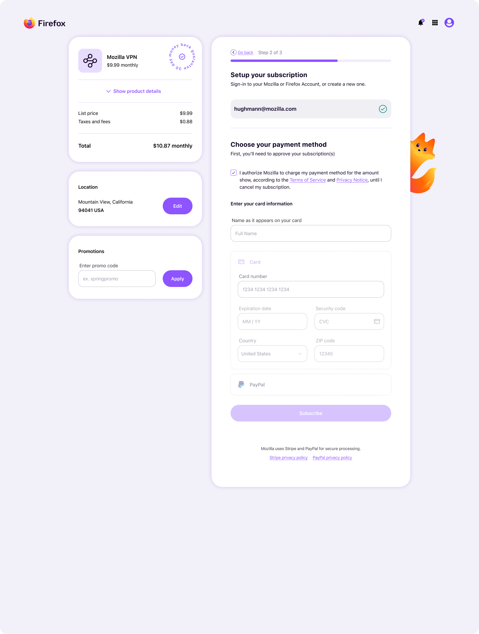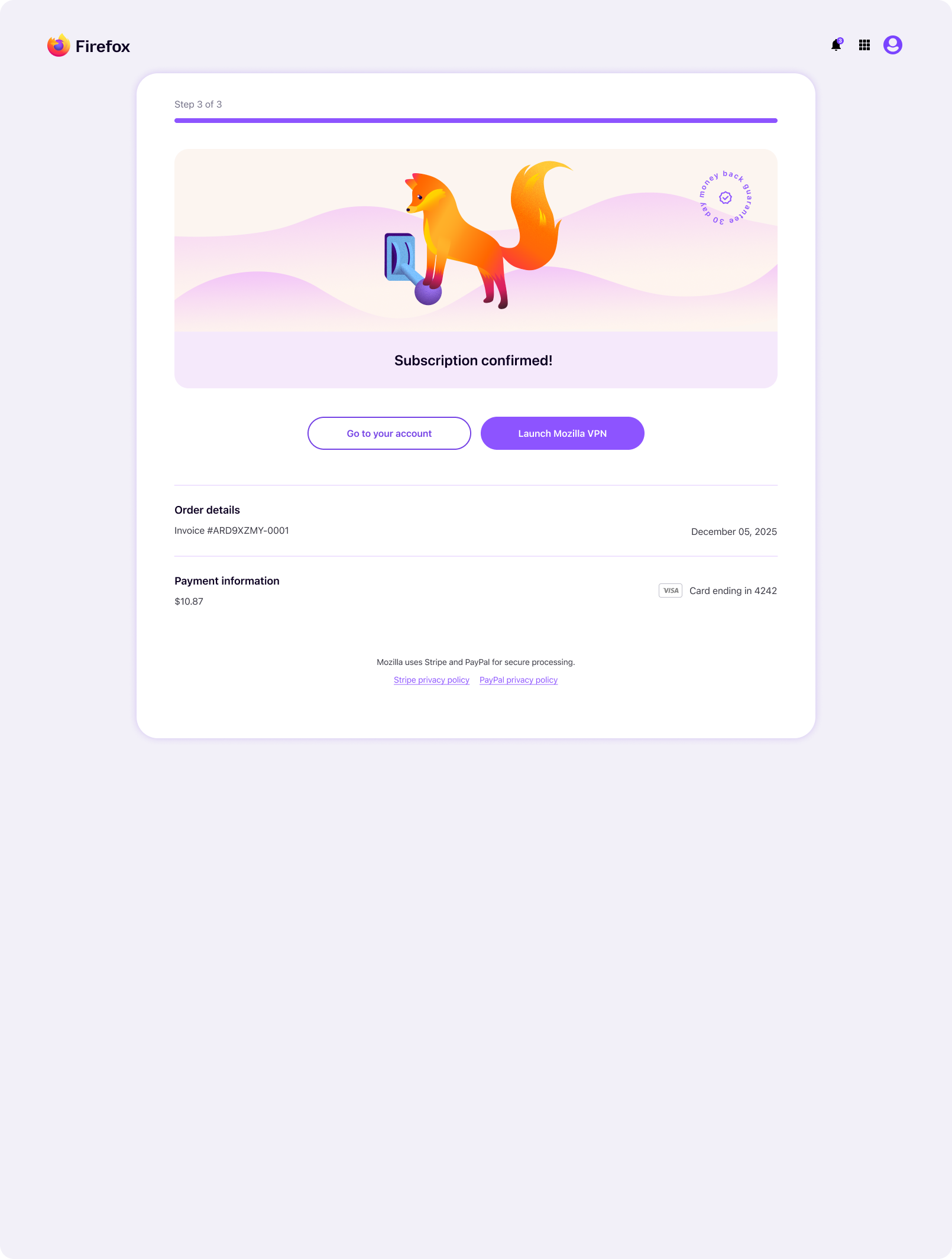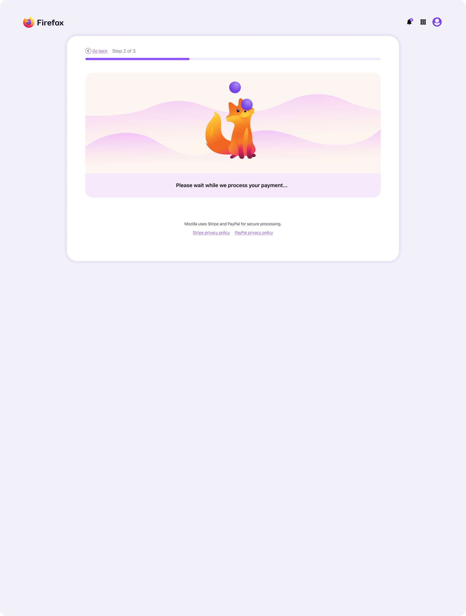 New visual concepts were crafted in collaboration with Accounts’ UX manager and Subplat’s product manager. We were all keen on adding delightful elements, such as instances of Firefox’s new mascot (aka Kit), confetti, animated transitions, and motion graphics. Applied thoughtfully, this level of care for the user creates warmth, and a stronger sense of responsiveness, helping sign-up and subscription flows feel more engaging.