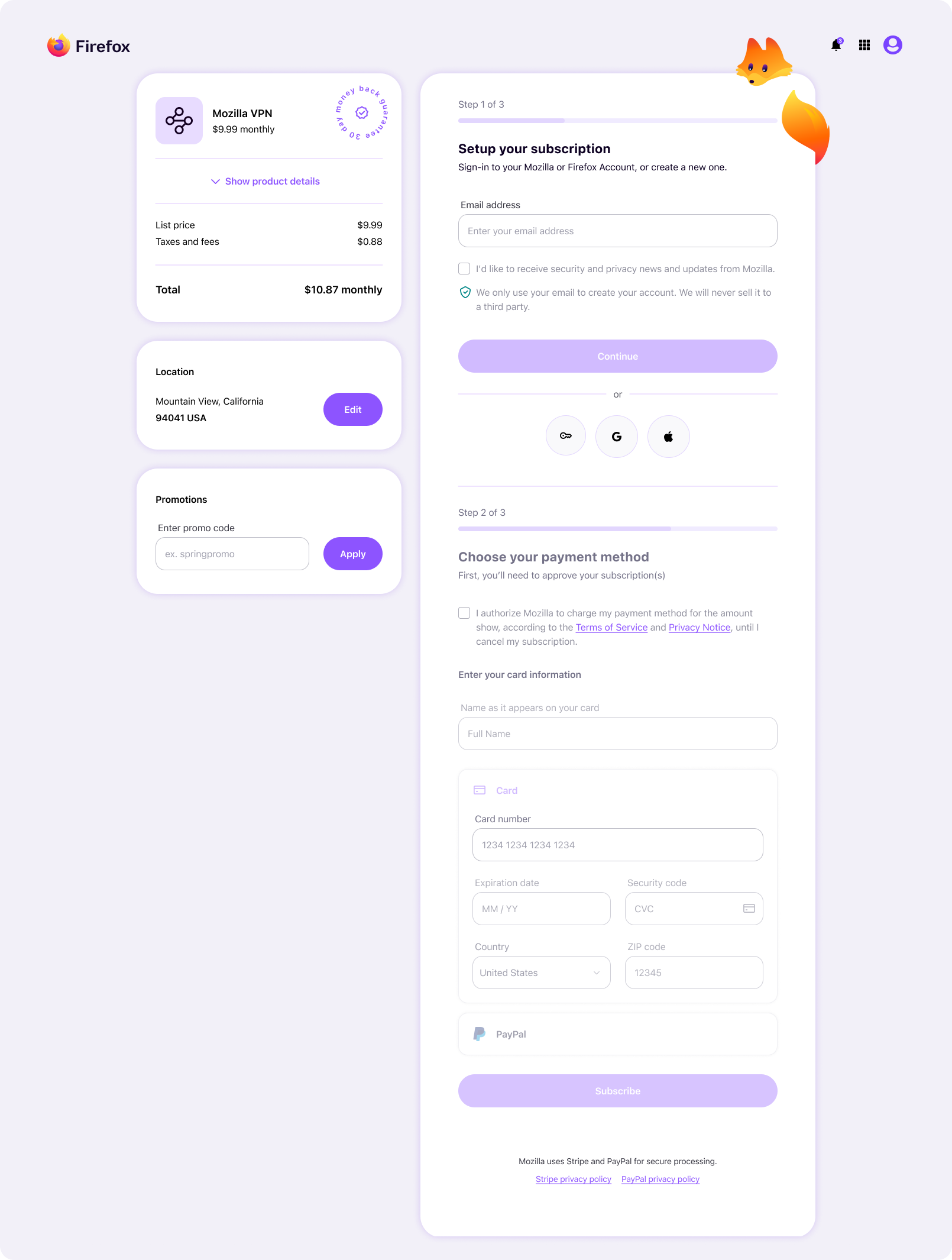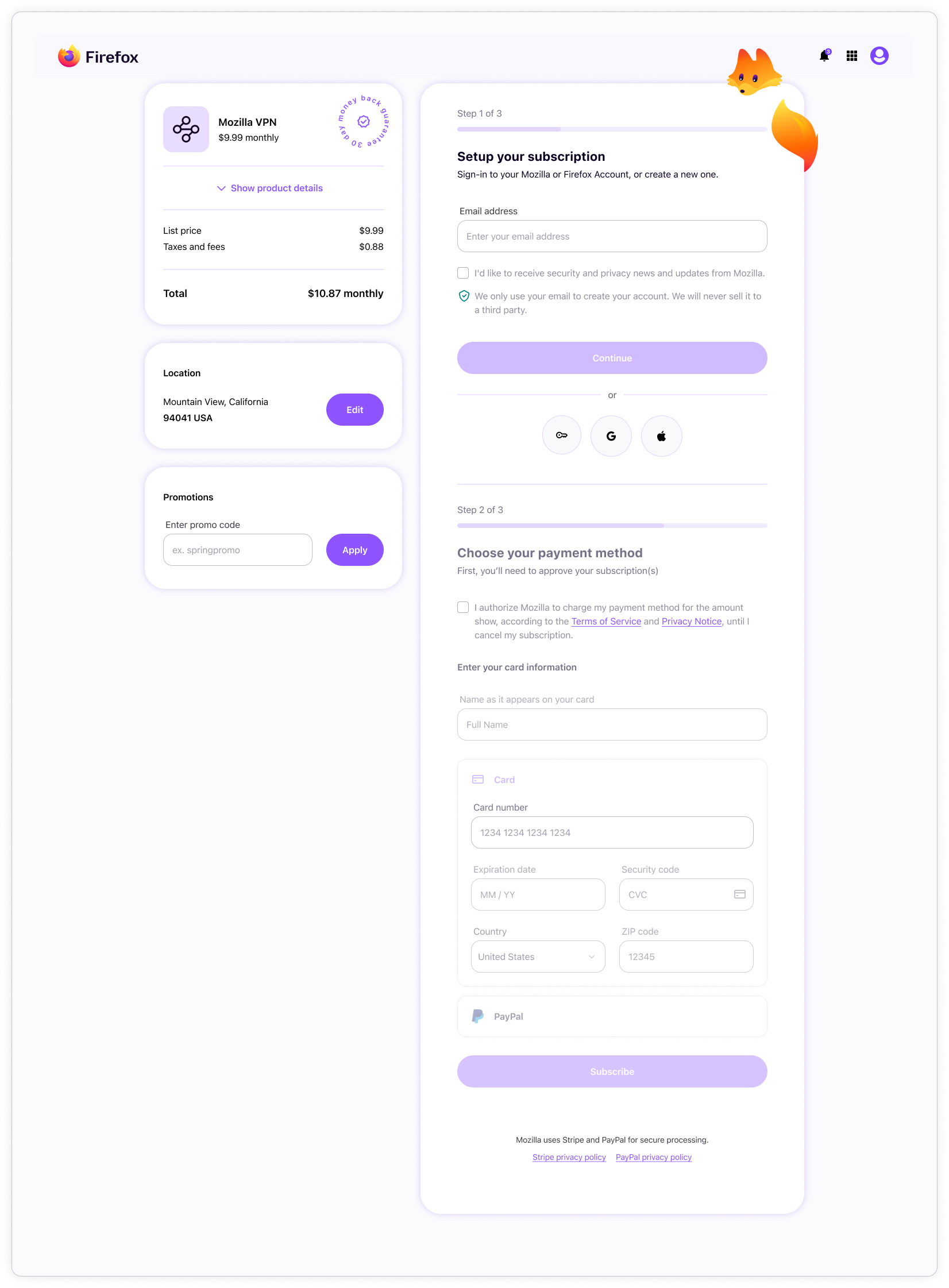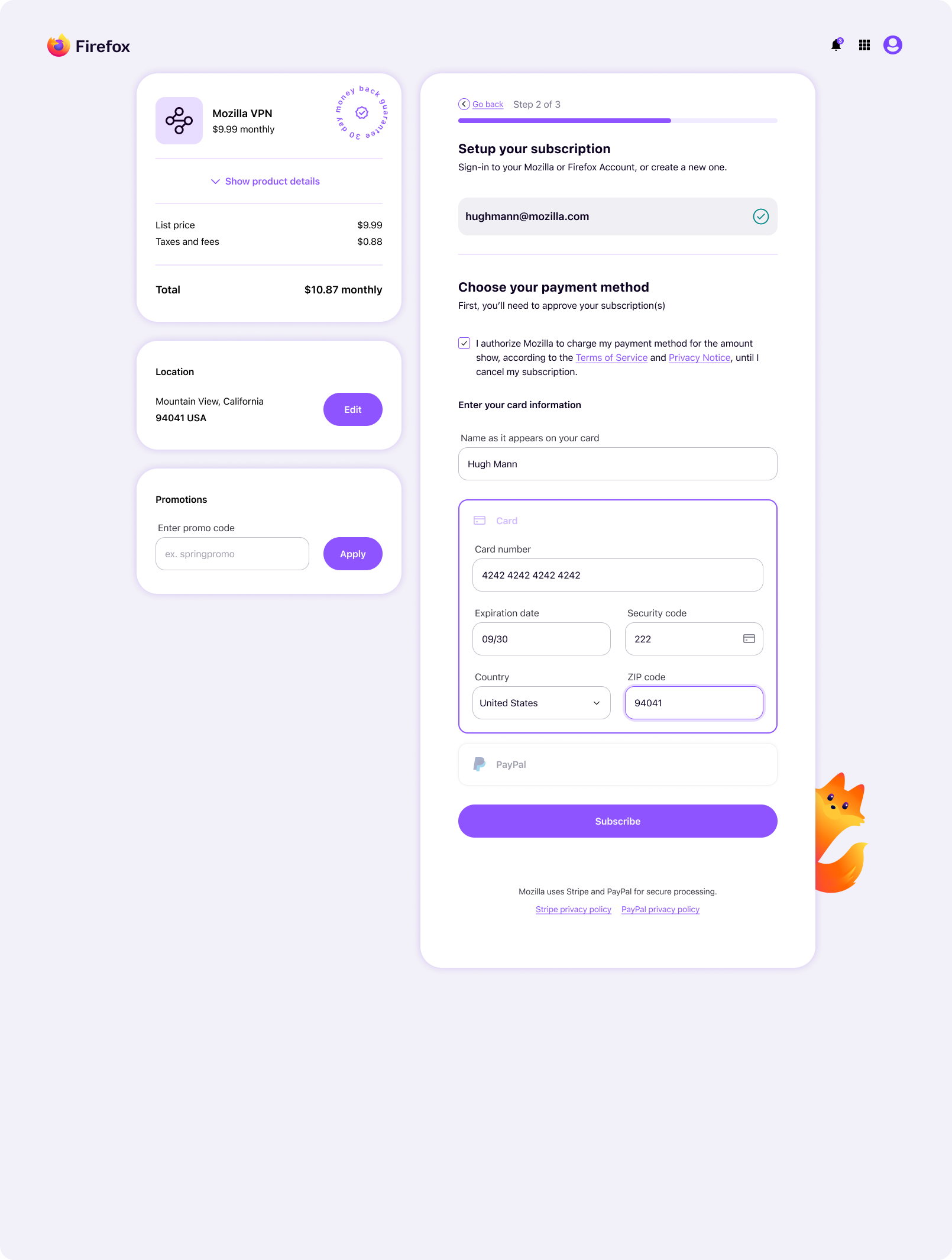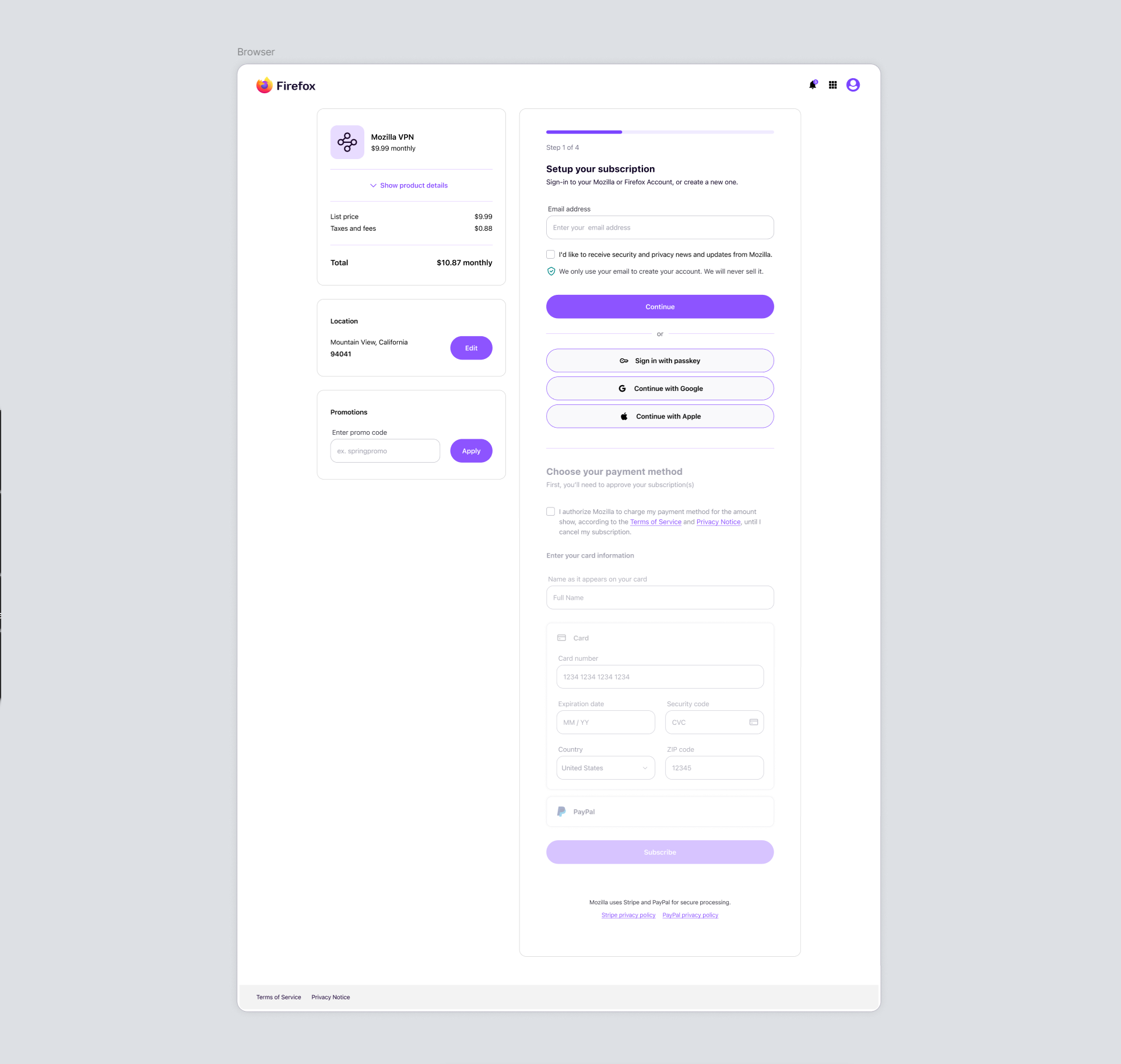 New visual concepts were crafted in collaboration with Accounts’ UX manager and Subplat’s product manager. We were all keen on adding delightful elements, such as instances of Firefox’s new mascot (aka Kit), confetti, animated transitions, and motion graphics. Applied thoughtfully, this level of care for the user creates warmth, and a stronger sense of responsiveness, helping sign-up and subscription flows feel more engaging.