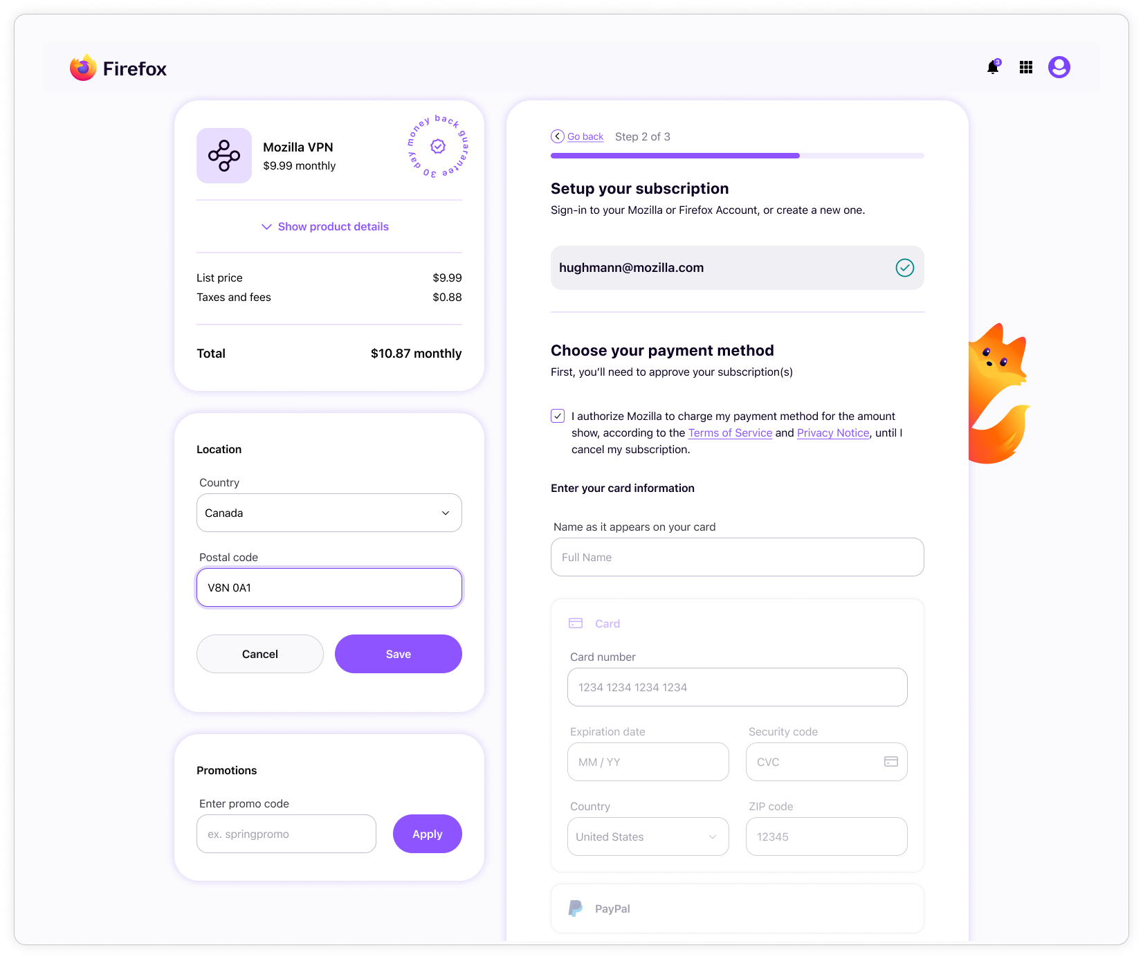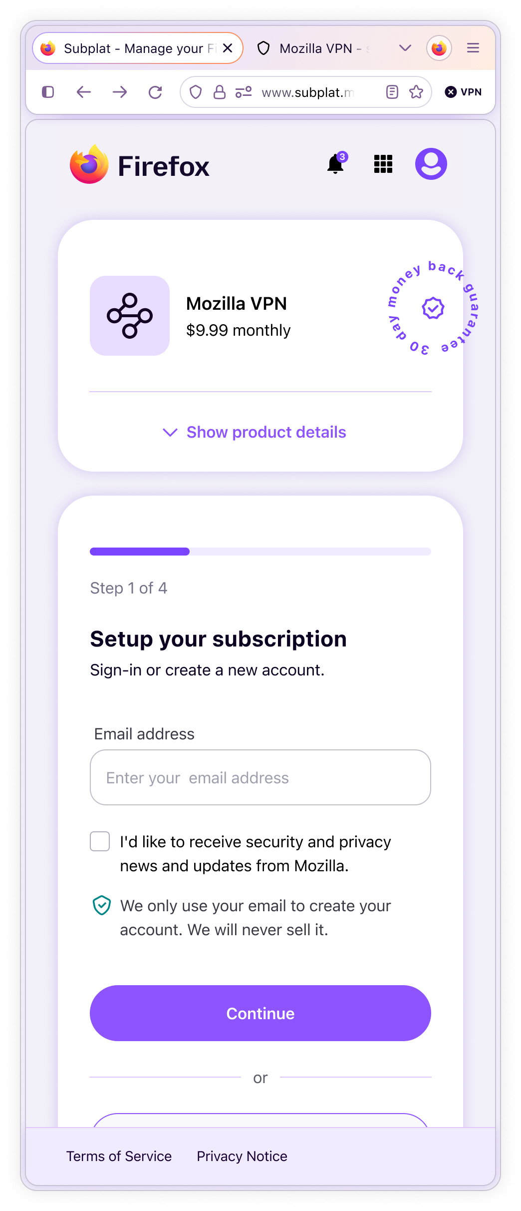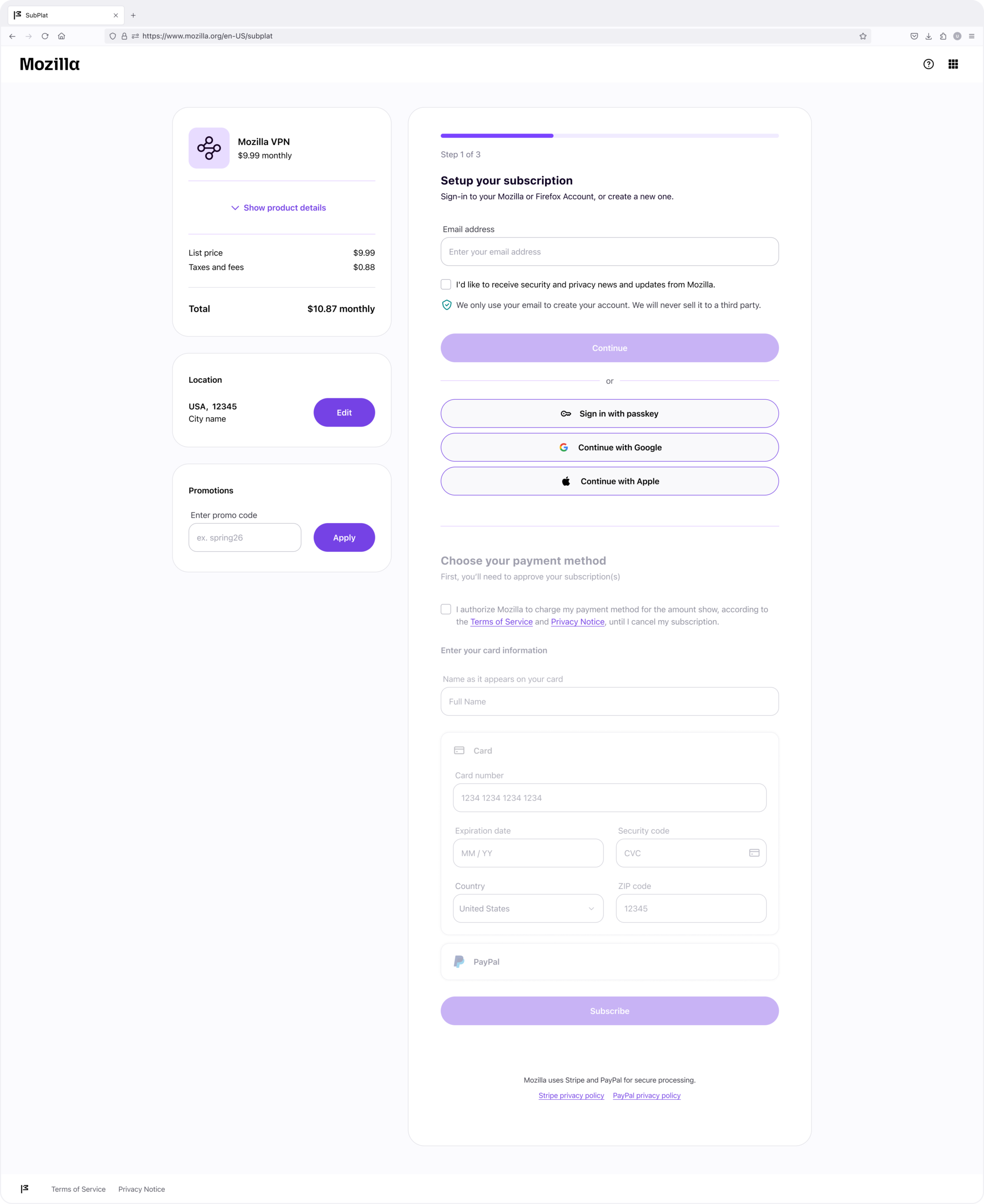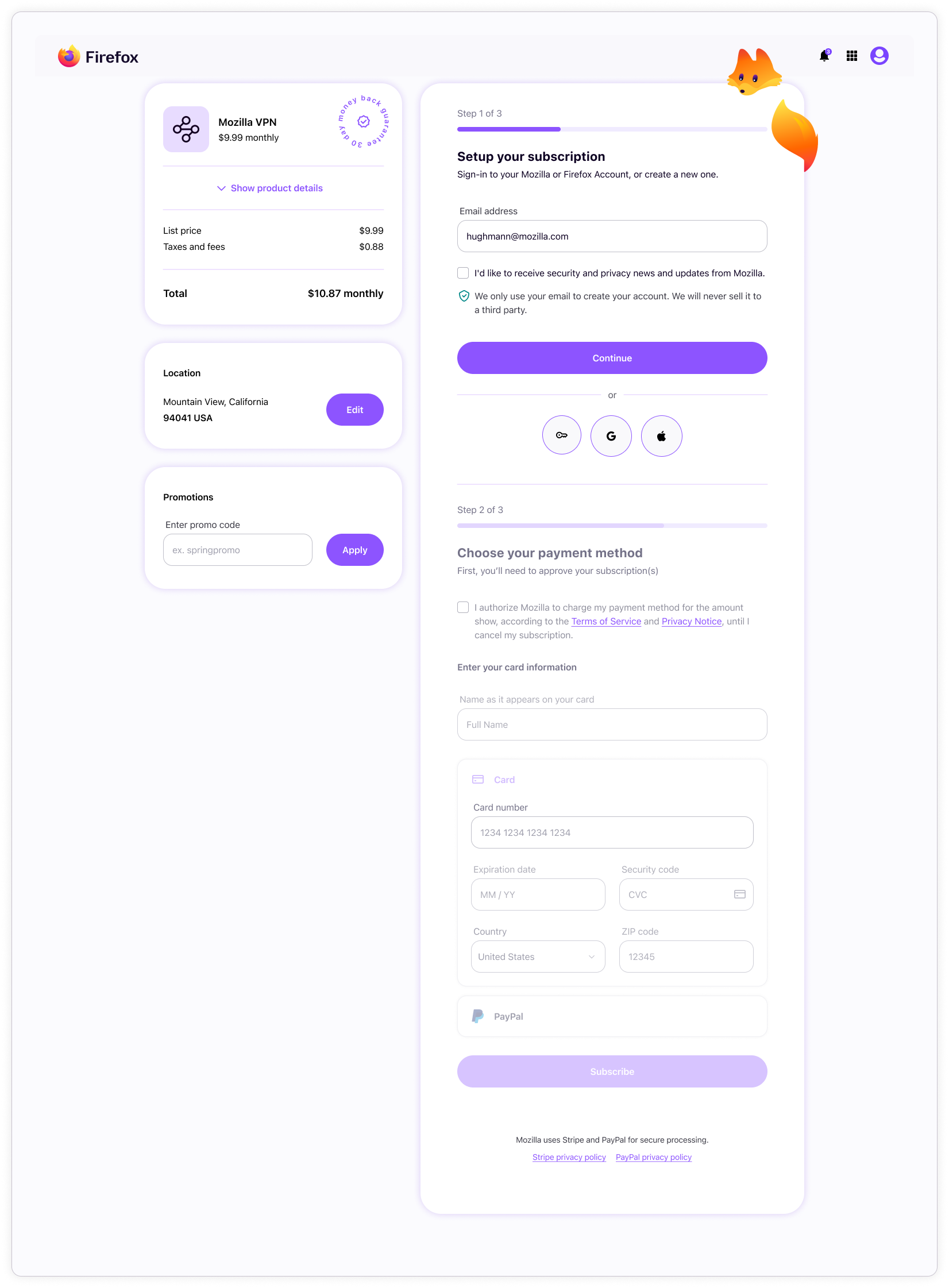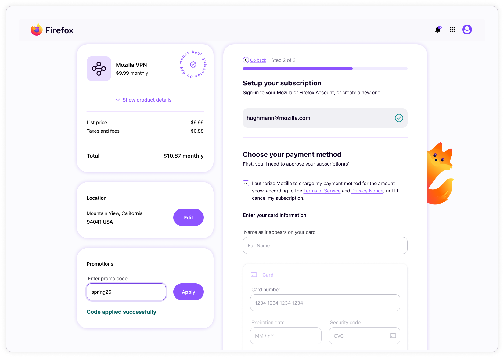 New visual concepts were crafted in collaboration with Accounts’ UX manager and Subplat’s product manager. We were all keen on adding delightful elements, such as instances of Firefox’s new mascot (aka Kit), confetti, animated transitions, and motion graphics. Applied thoughtfully, this level of care for the user creates warmth, and a stronger sense of responsiveness, helping sign-up and subscription flows feel more engaging.