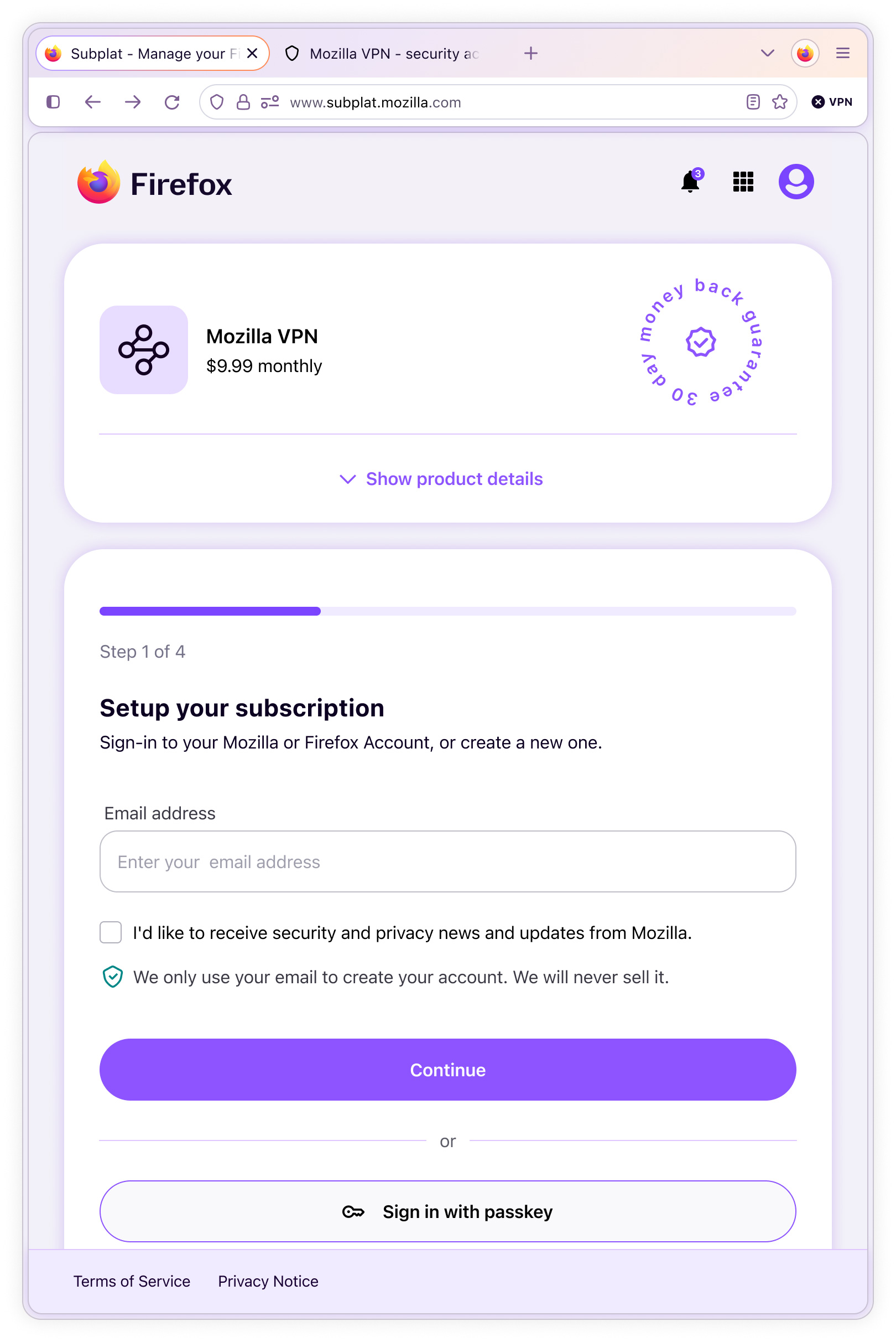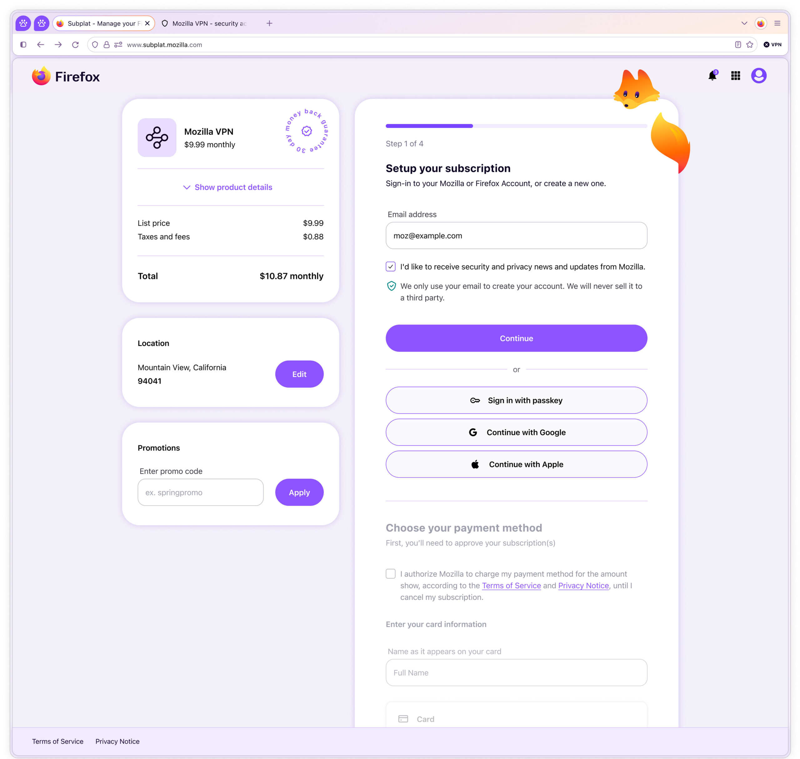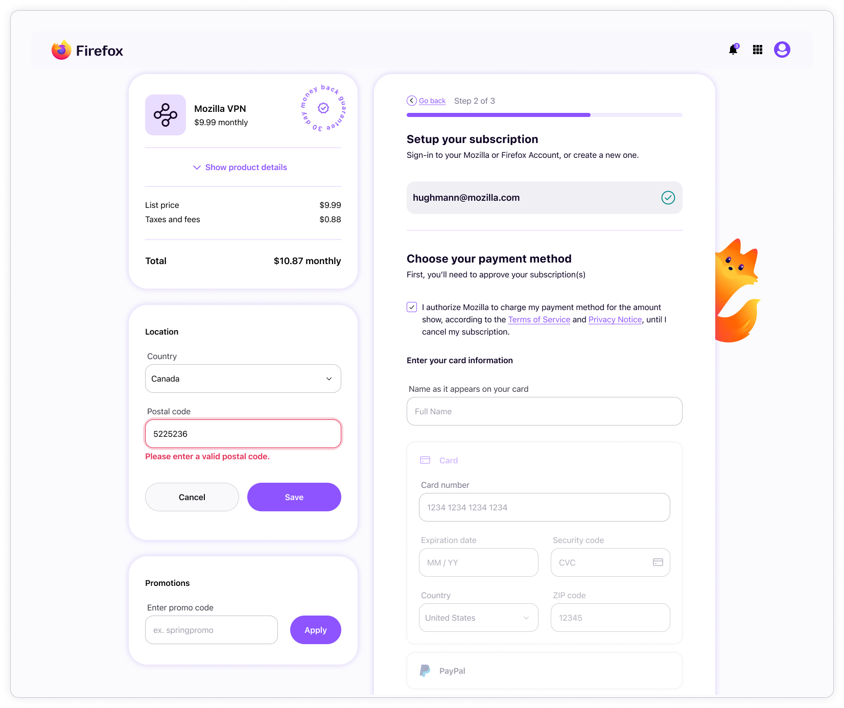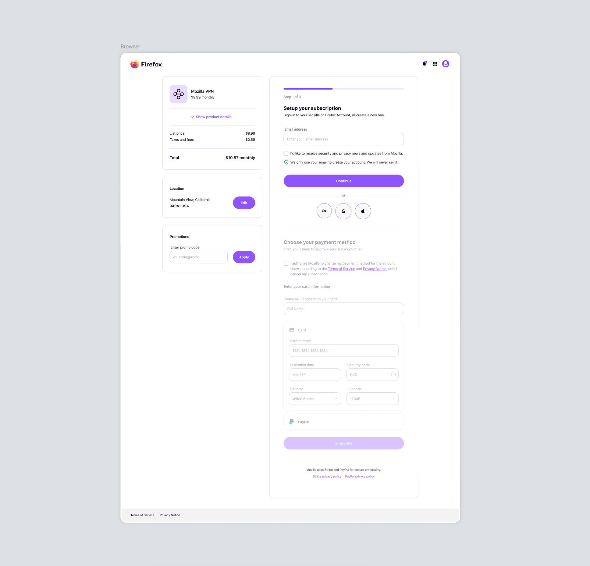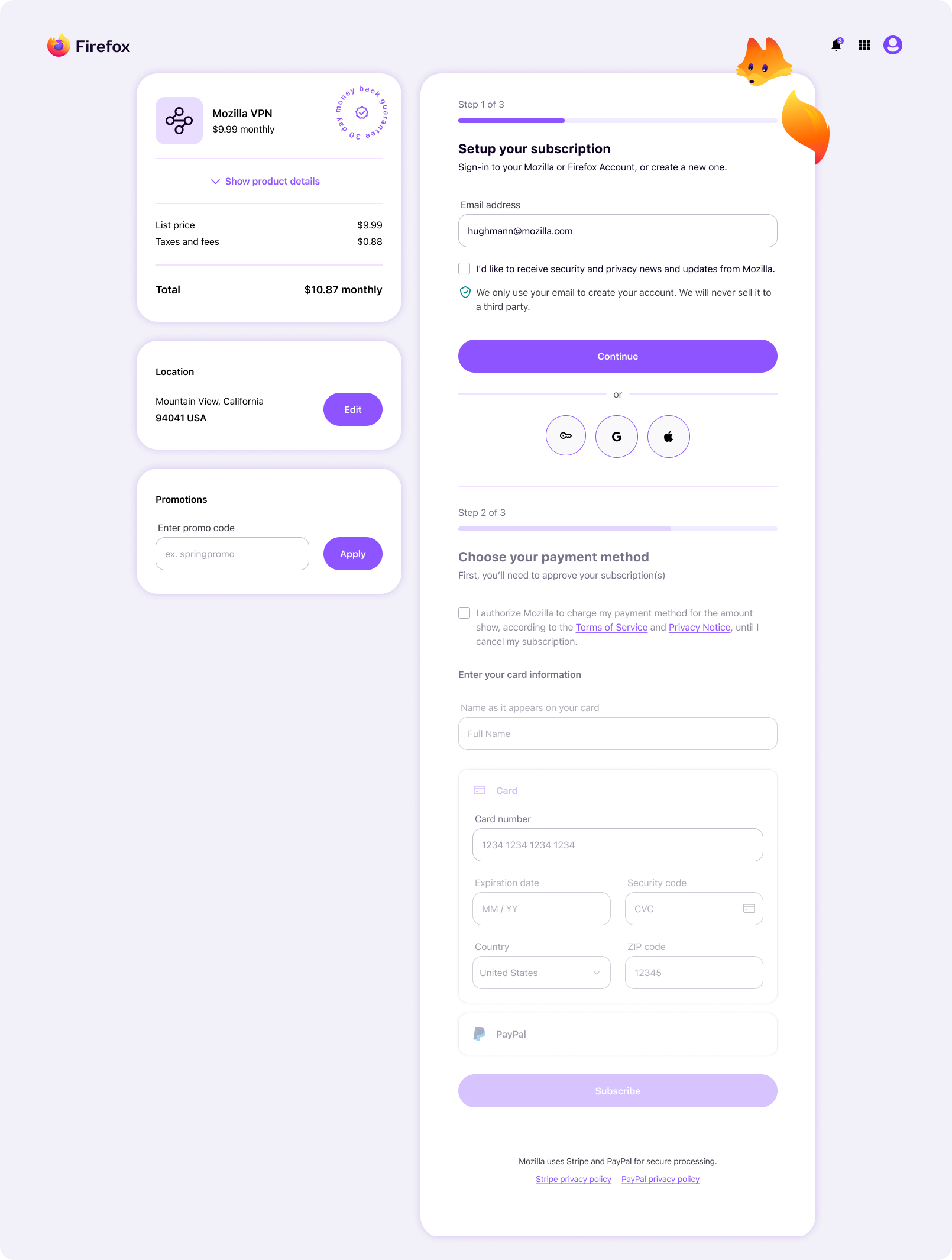 New visual concepts were crafted in collaboration with Accounts’ UX manager and Subplat’s product manager. We were all keen on adding delightful elements, such as instances of Firefox’s new mascot (aka Kit), confetti, animated transitions, and motion graphics. Applied thoughtfully, this level of care for the user creates warmth, and a stronger sense of responsiveness, helping sign-up and subscription flows feel more engaging.