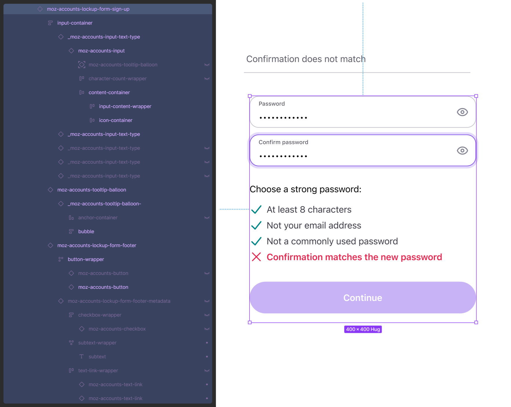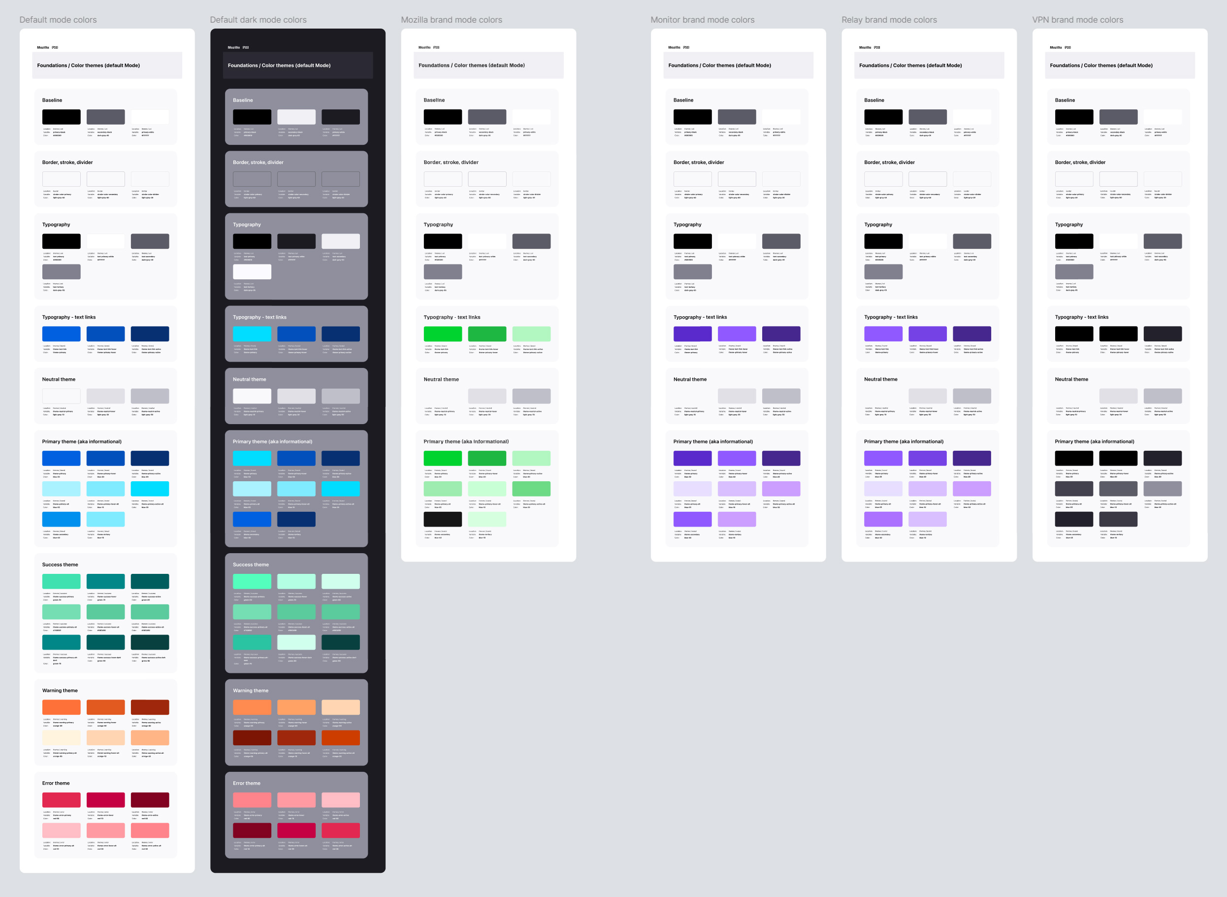 Because users can enter account and subscription flows from Mozilla, Firefox, Monitor, Relay, or VPN entry points, the system needed to support multiple brand contexts cleanly. I built brand automation into the library using modes, allowing designers to switch between product brands from a simple dropdown and automatically update visual styling across the flow.