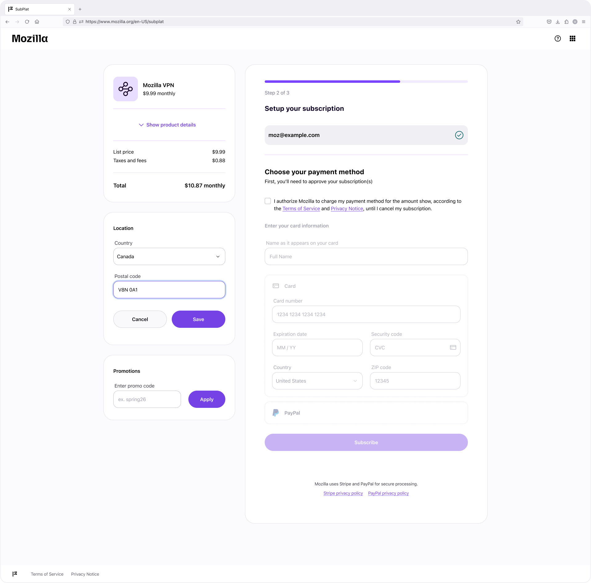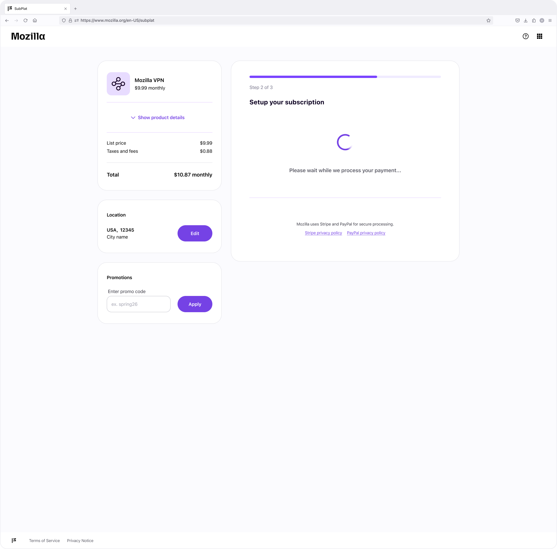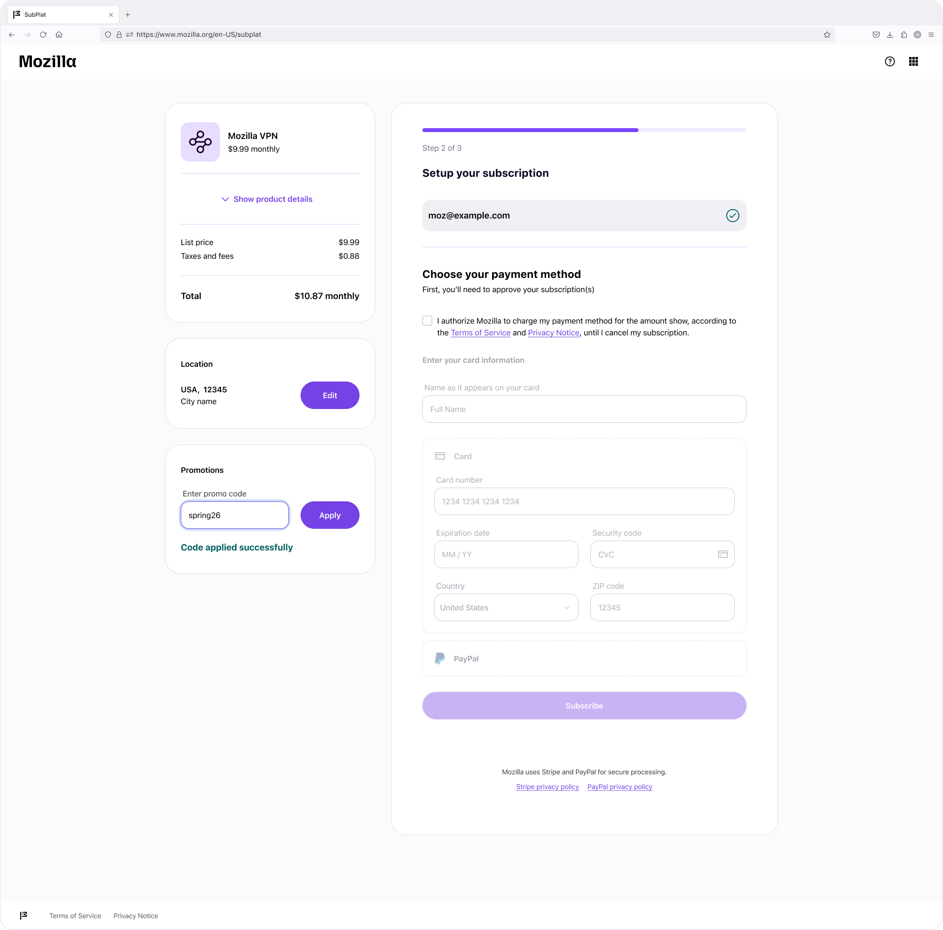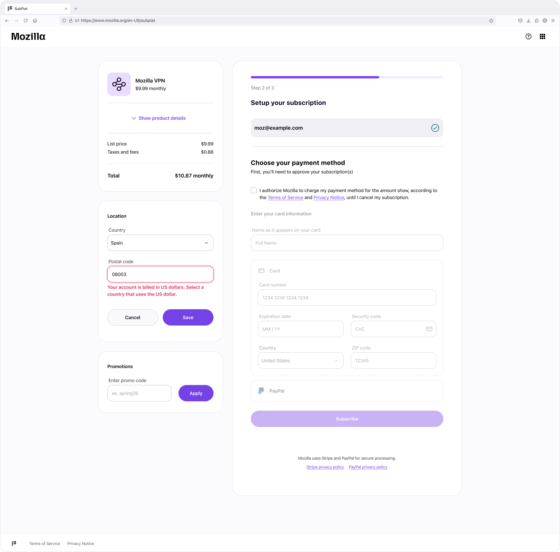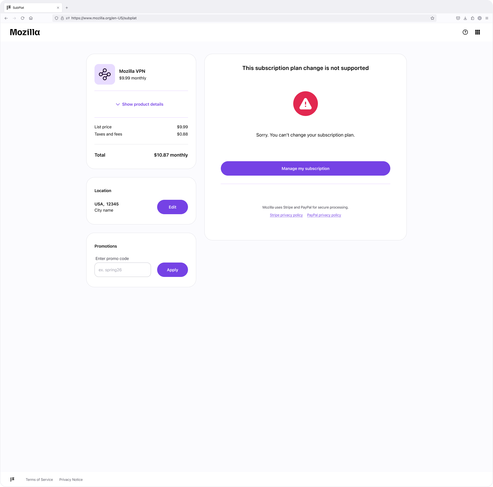 Subplat also supports promo codes, which have a single error state for invalid promo codes.