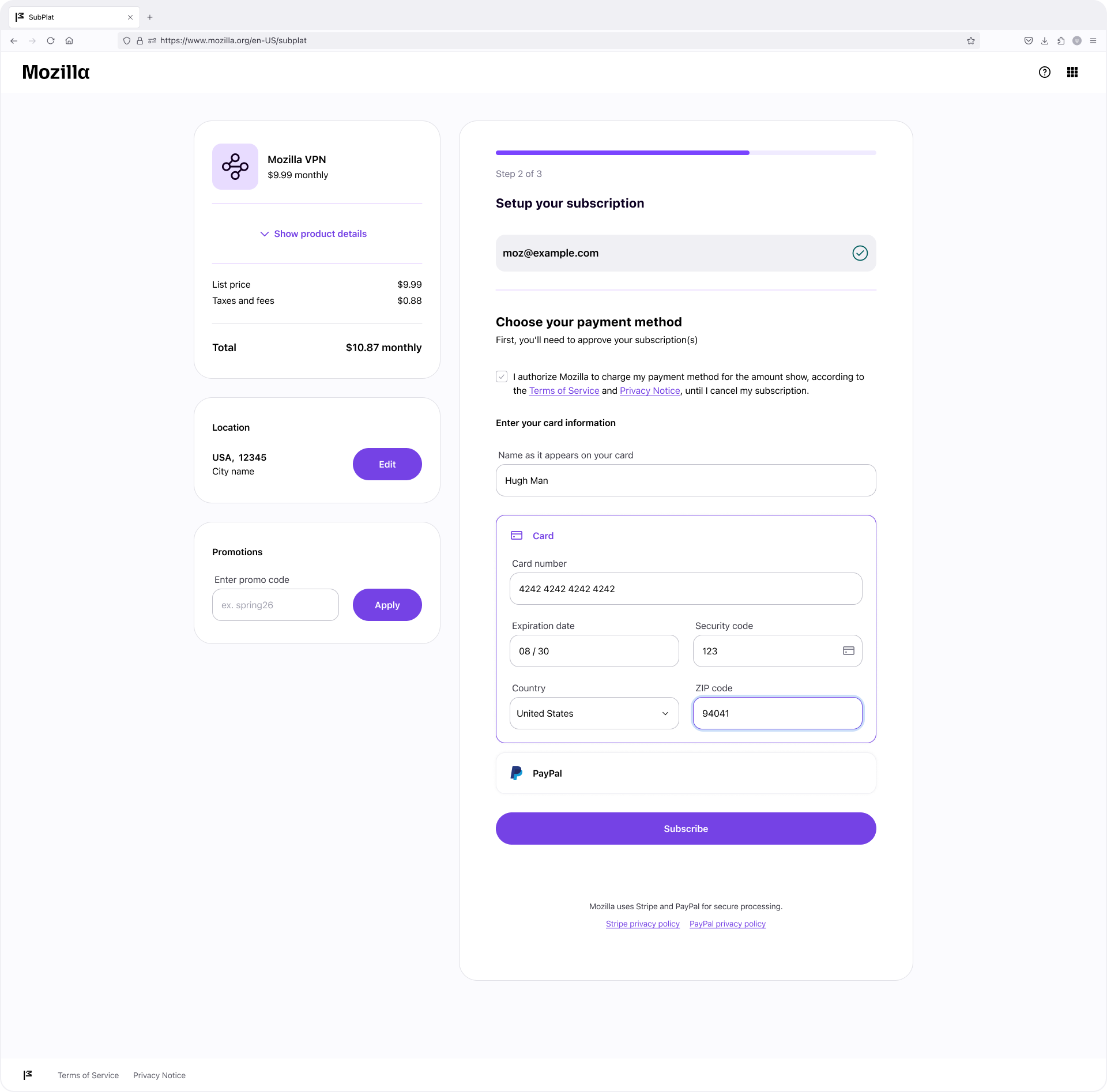 Once payment information is collected, the “subscribe” button becomes active. Clicking this button starts the payment verification process and returns either success or one of many error types.