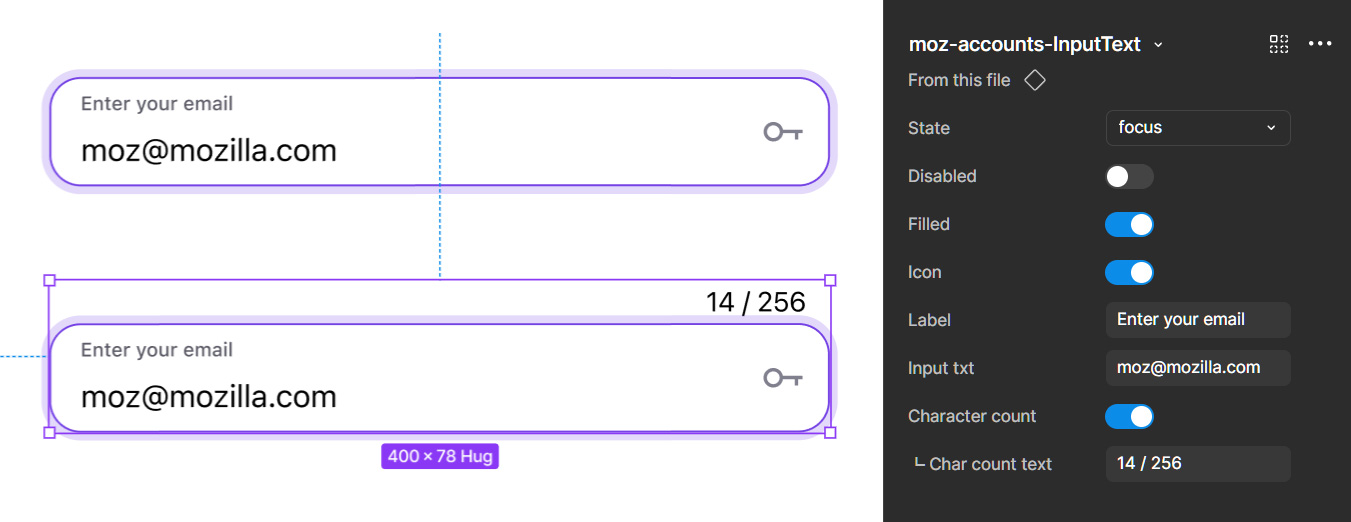 Input components include comprehensive properties to allow full configuration. They’re also designed to map content between variants and other input components when nested in a lockup component.