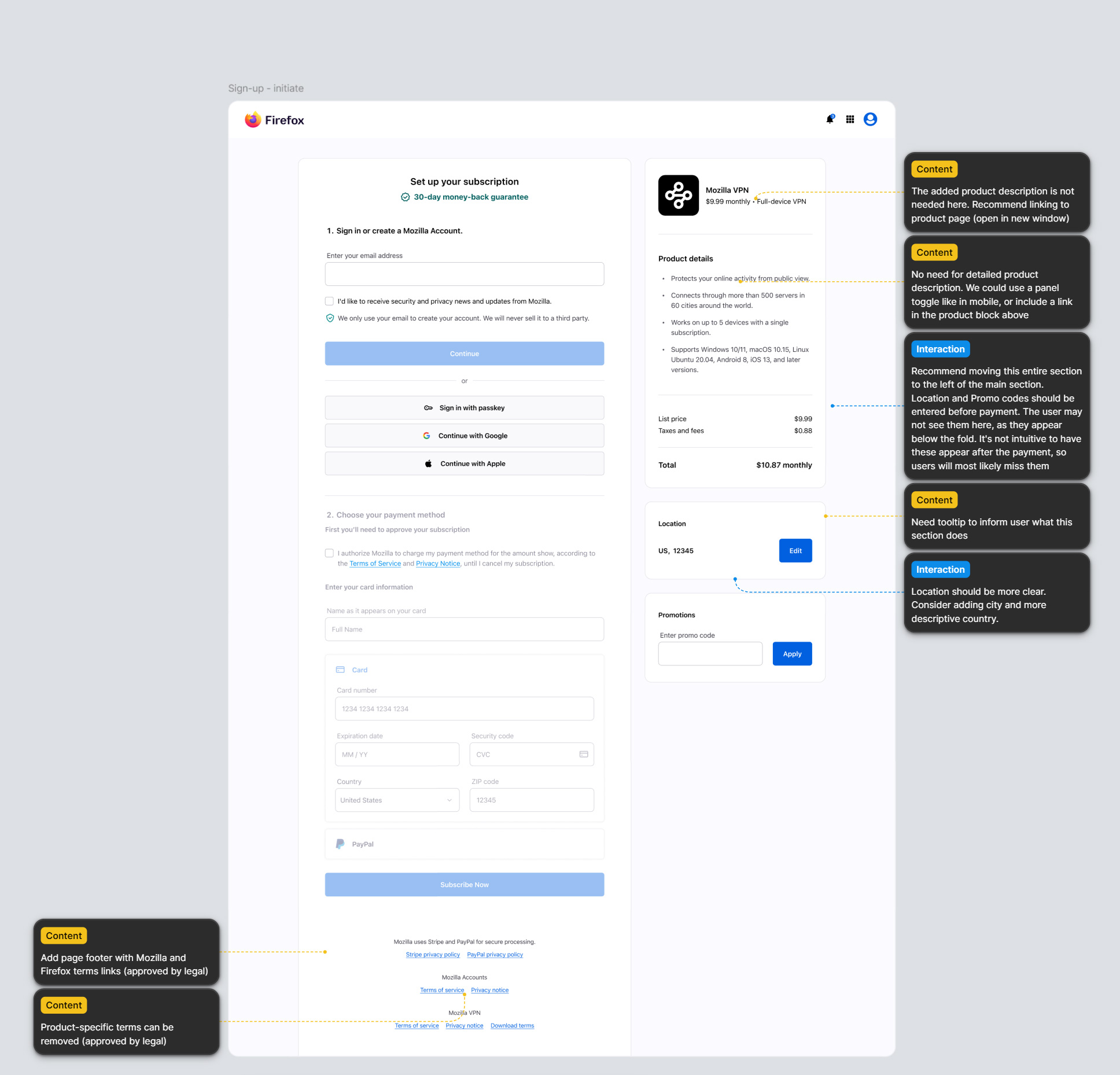 The following shows Subplat’s initial payment screen with annotations from the audit. The last image shows the result of updating just the most immediate concerns, before the larger visual refresh.