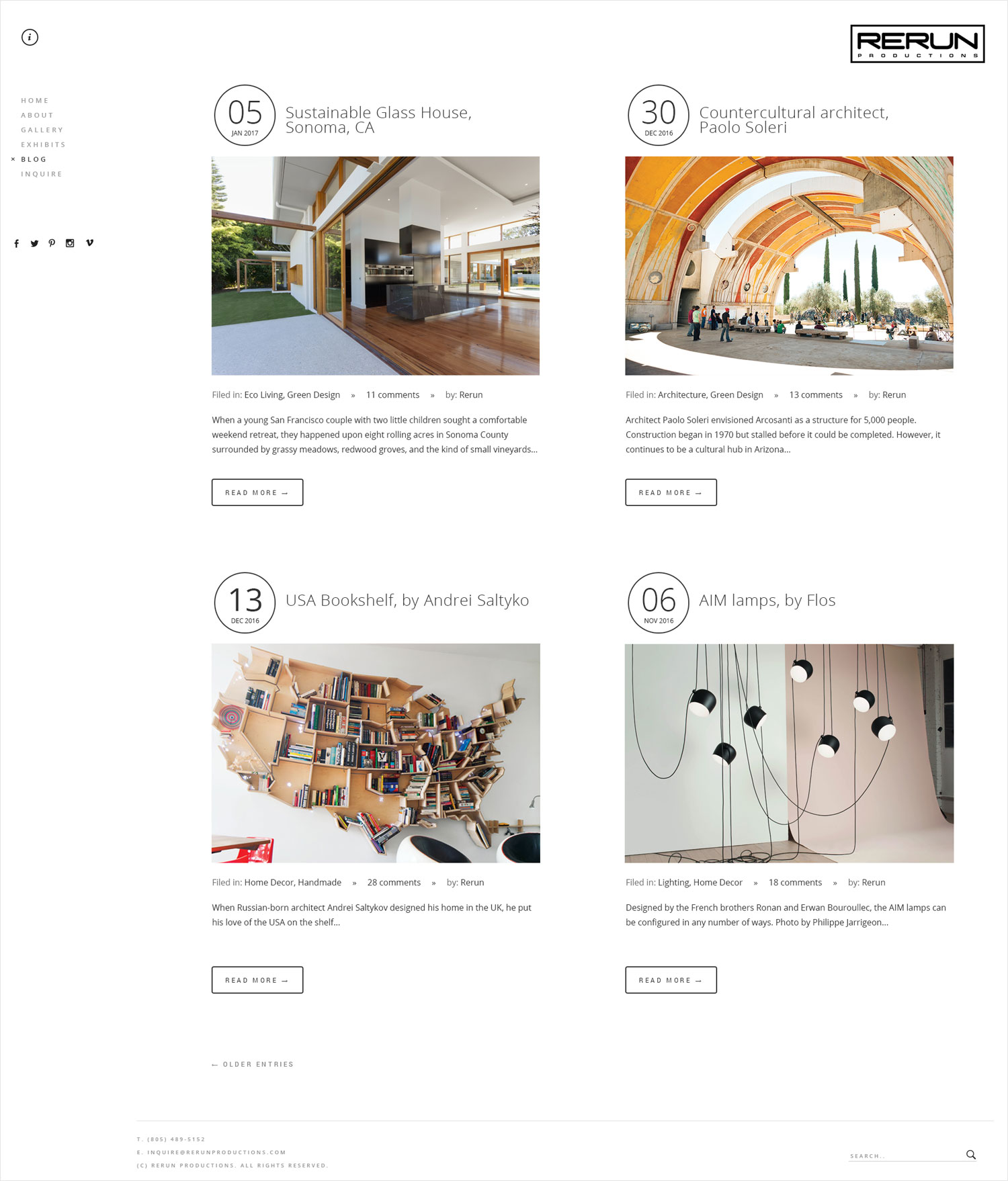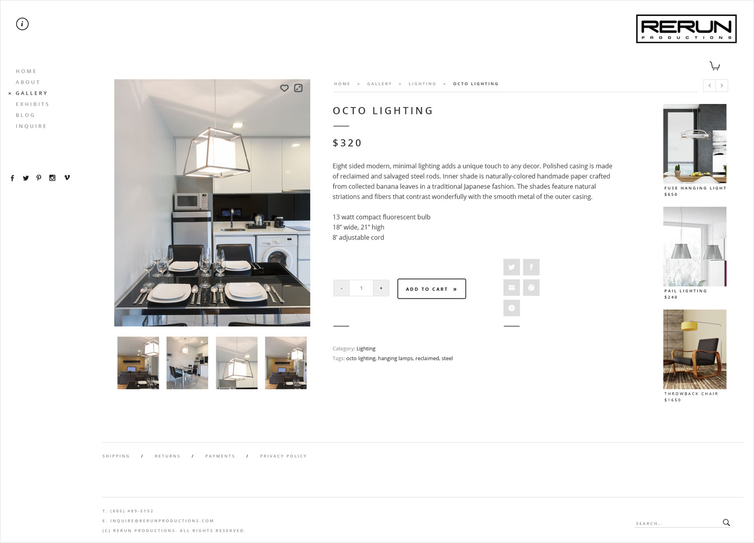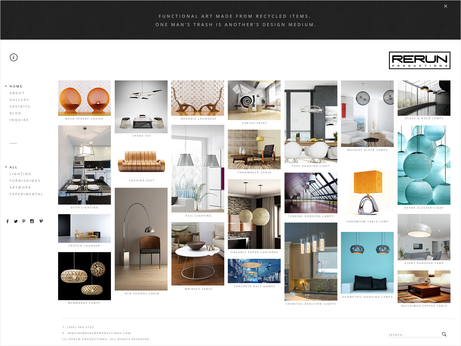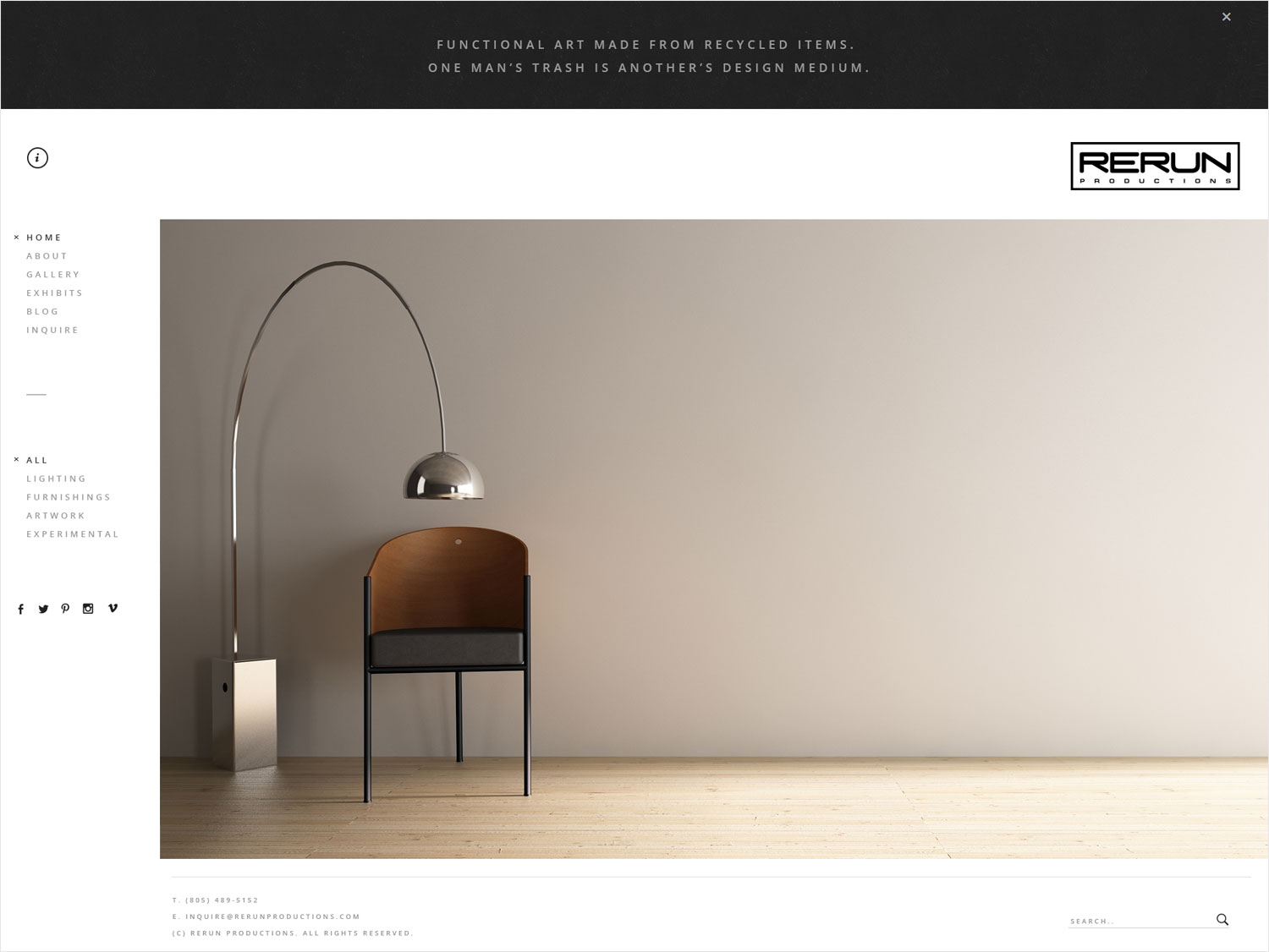 I’ve worked with Rerun since 2006, having revamped their website a number of times. This latest iteration consists of an ultra-minimal, mid-century modern X industrial design that showcases Rerun’s work and allows for easy contact and purchase.