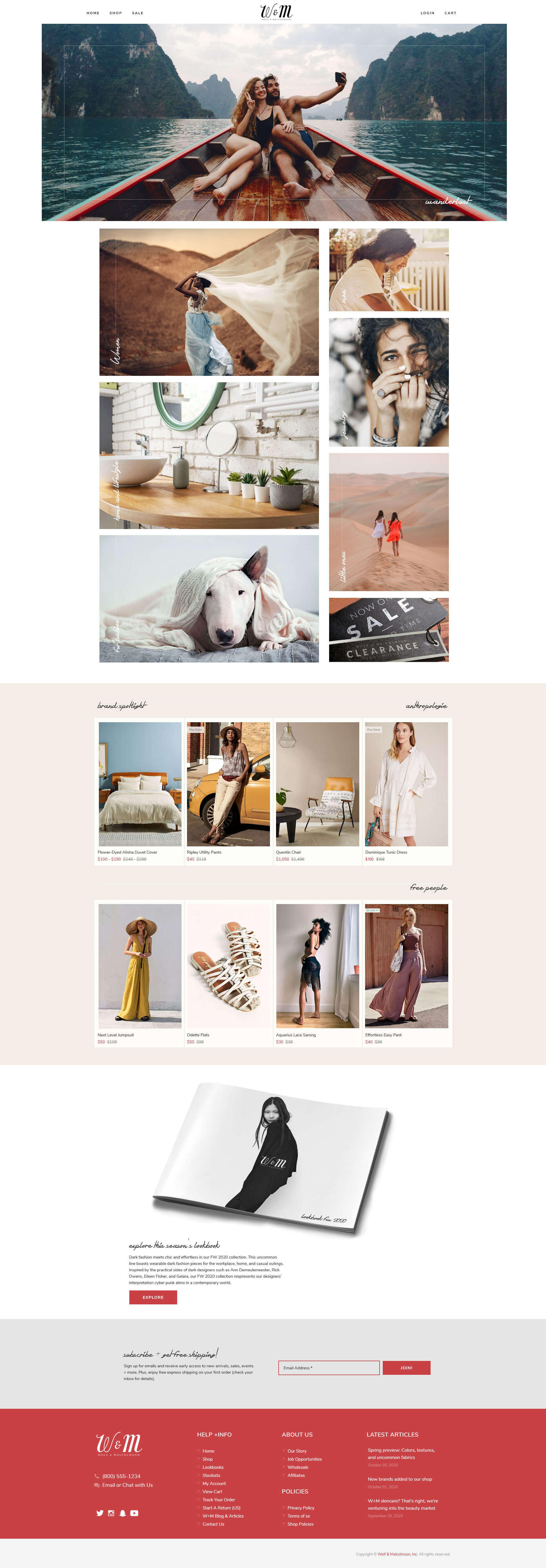 W&M’s revenue is generated primarily through their ecommerce website, with a DTC model that caters to style- and aesthetic-centric consumers. As such, the goal of the UI was to ensure key shopping actions could be easily performed, without sacrificing the company’s visual appeal. W&M’s primary consumer is what we referred to internally as “vibe people” – a wide ranging age group, predominantly female, and who enjoy creating aesthetic lifestyle compositions in many forms. With these personas in mind, I went with a quiet bohemian style with neutral colors and extra focus on photography selection. The design is inspired by the primary brands resold on the site: Anthropologie and Free People.